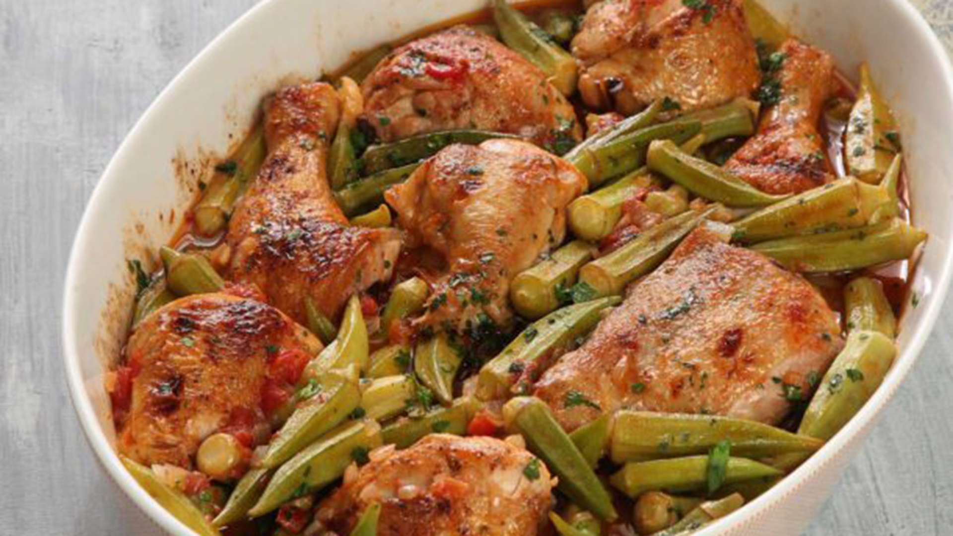 Για να φτιάξουμε κοτόπουλο με μπάμιες στον φούρνο, σε ένα τηγάνι ζεσταίνουμε σε δυνατή φωτιά το μισό ελαιόλαδο και σοτάρουμε το κοτόπουλο με αλατοπίπερο για 6-7 λεπτά ή μέχρι να ροδίσει.
