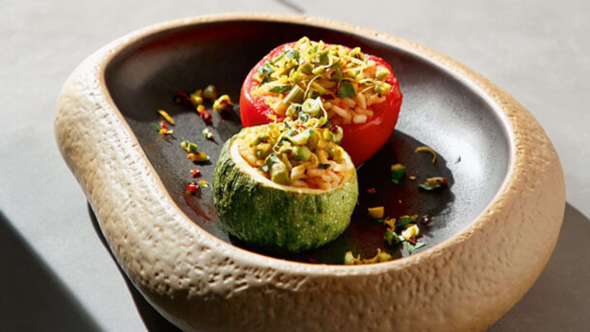 Για να φτιάξουμε τα γεμιστά με φυστίκι Αιγίνης, κόβουμε από τις ντομάτες, τις πιπεριές και τα κολοκυθάκια ένα «καπάκι» στην πλευρά με το κοτσάνι.