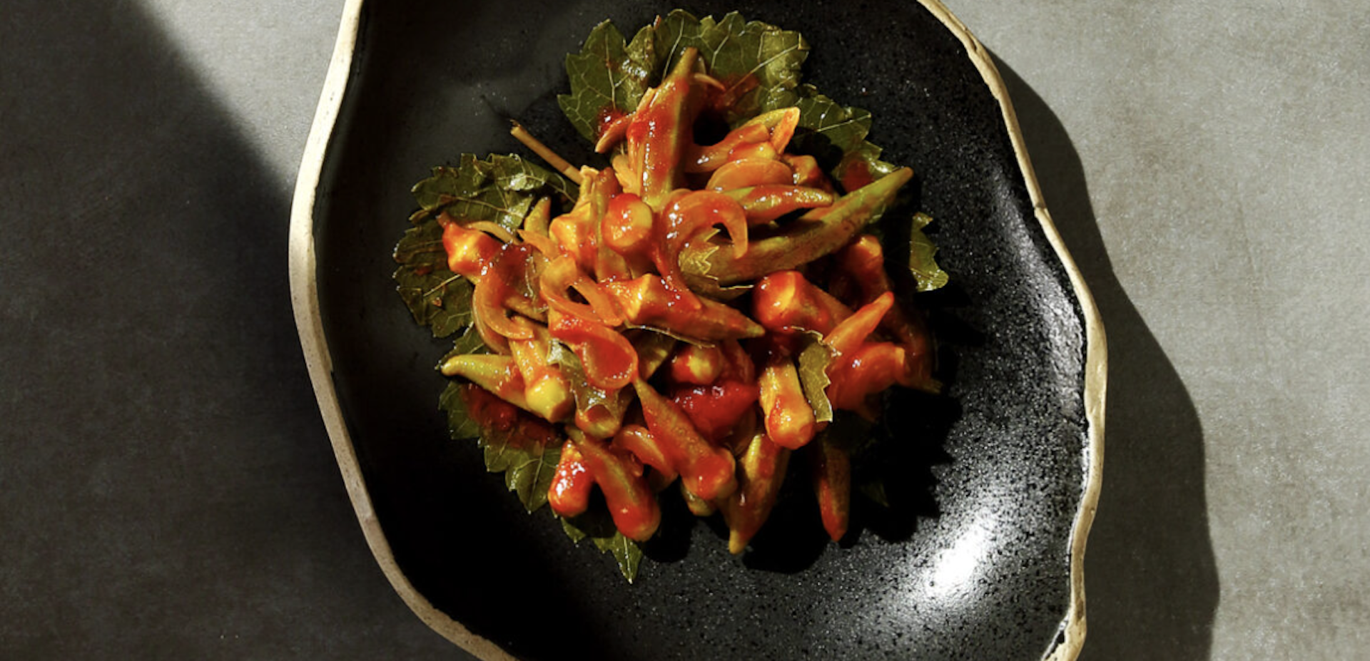 Δύο υλικά απογειώνουν ένα, κατά τα άλλα, τυπικό λαδερό με μπάμιες: τα αμπελόφυλλα χαρίζουν την ευχάριστη ξινάδα τους και το δίκταμο το άρωμά του.
