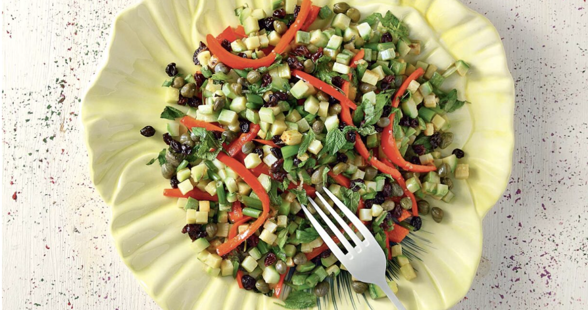 Ζεστή πλούσια σαλάτα με γλυκά κολοκυθάκια, κάππαρη, σταφίδες και για μια πικάντικη νότα, πιπεριές τσίλι.