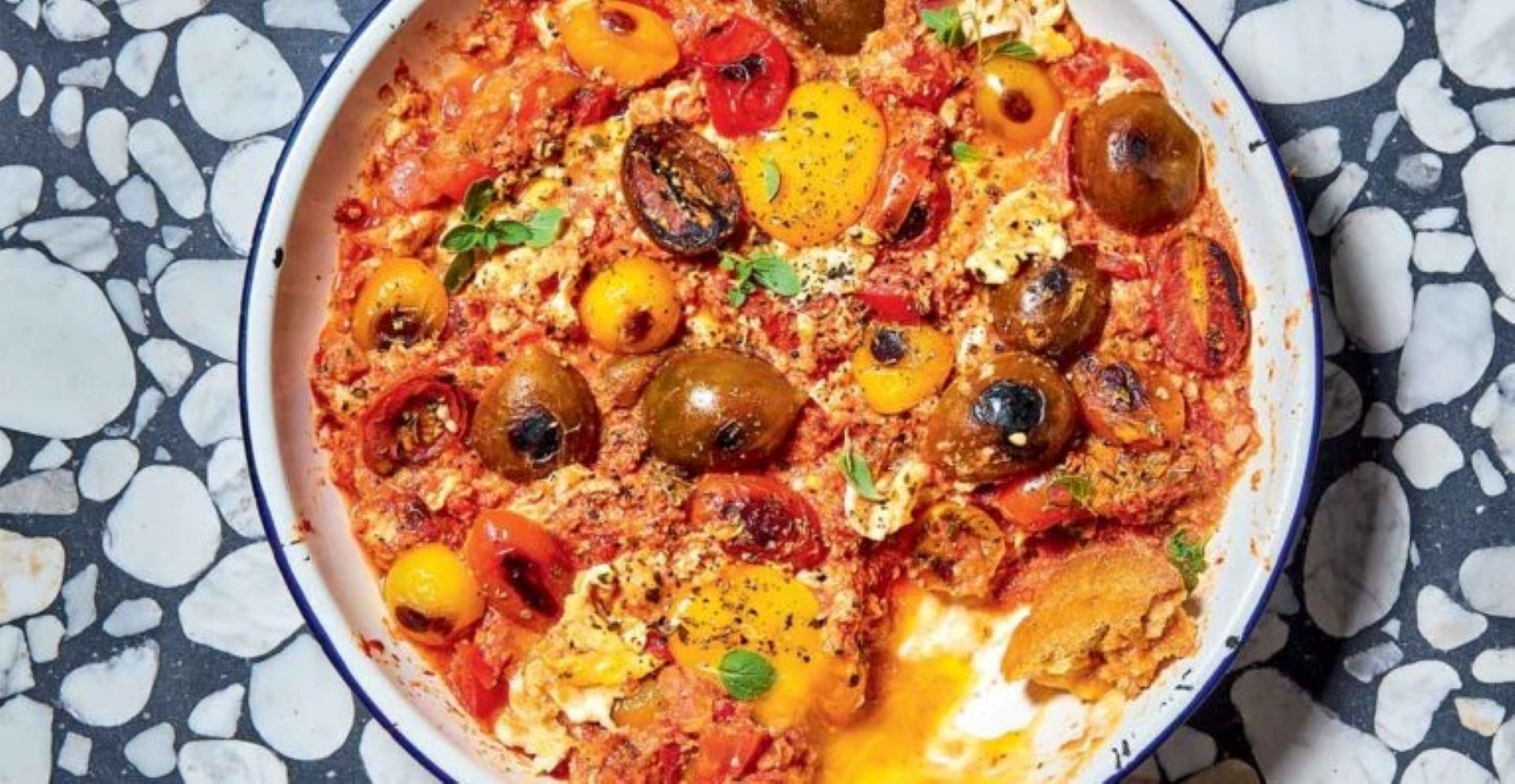 Ψήνουμε τα ντοματίνια για 40 λεπτά, μέχρι να μελώσουν και να ζαρώσει η φλούδα τους. Ξεφουρνίζουμε και τα αφήνουμε να κρυώσουν (αν θέλουμε, τα ξεφλουδίζουμε, η φλούδα αφαιρείται πολύ εύκολα).