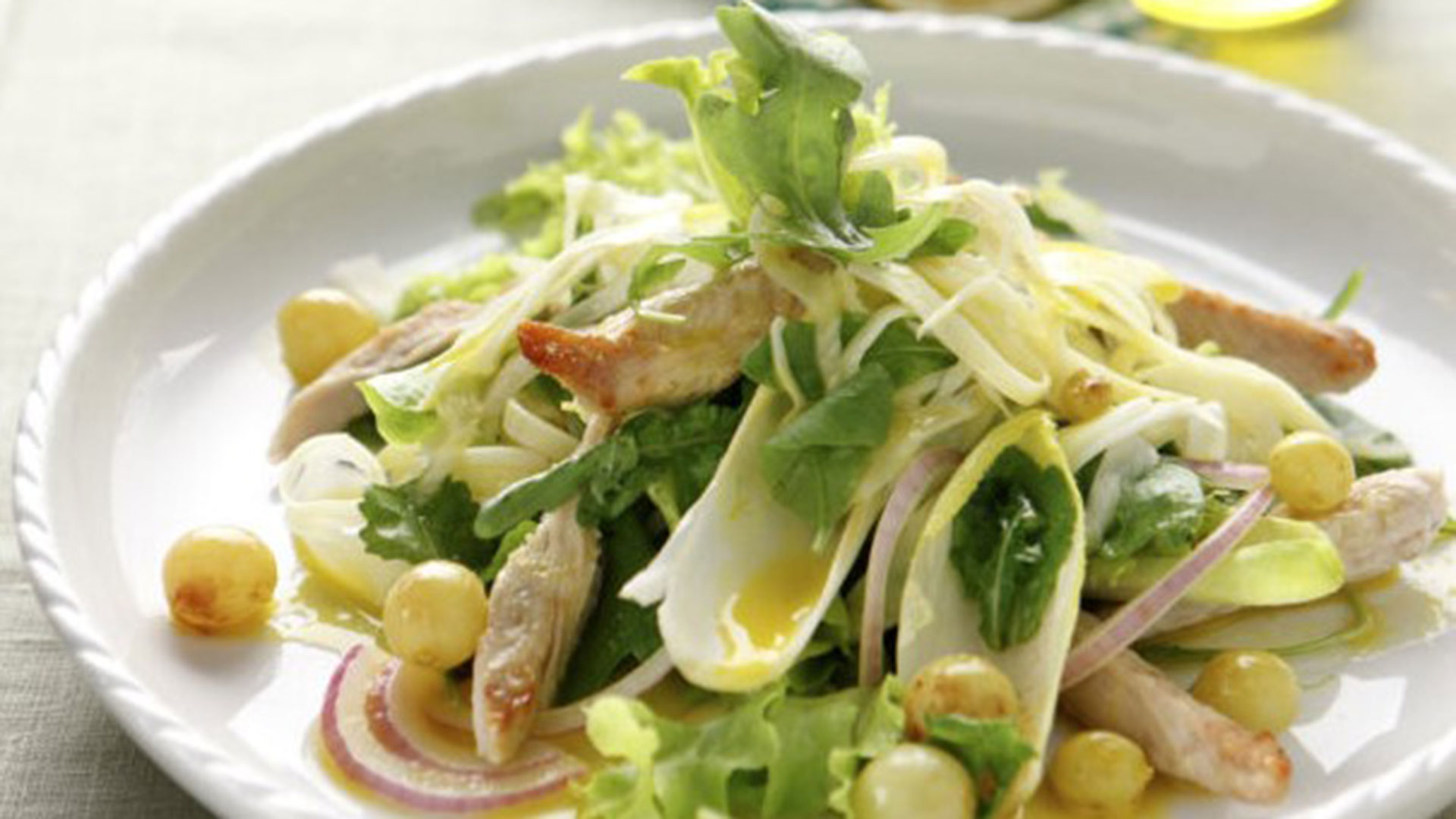 Για να ετοιμάσουμε την πράσινη σαλάτα με κοτόπουλο και λαδολέμονο με σταφύλια, ξεκινάμε από την μαρινάδα: Βάζουμε τις λωρίδες κοτόπουλου σε ένα ταψάκι, τις αλατοπιπερώνουμε και ραντίζουμε με το λάδι και το χυμό πορτοκαλιού.