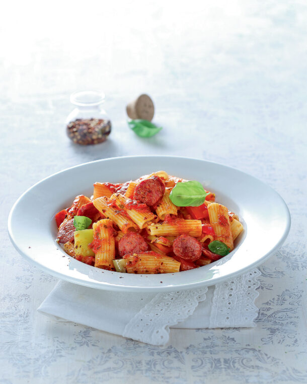 - 4 μέτρια χωριάτικα λουκάνικα, κομμένα σε ροδέλες 1 εκ.