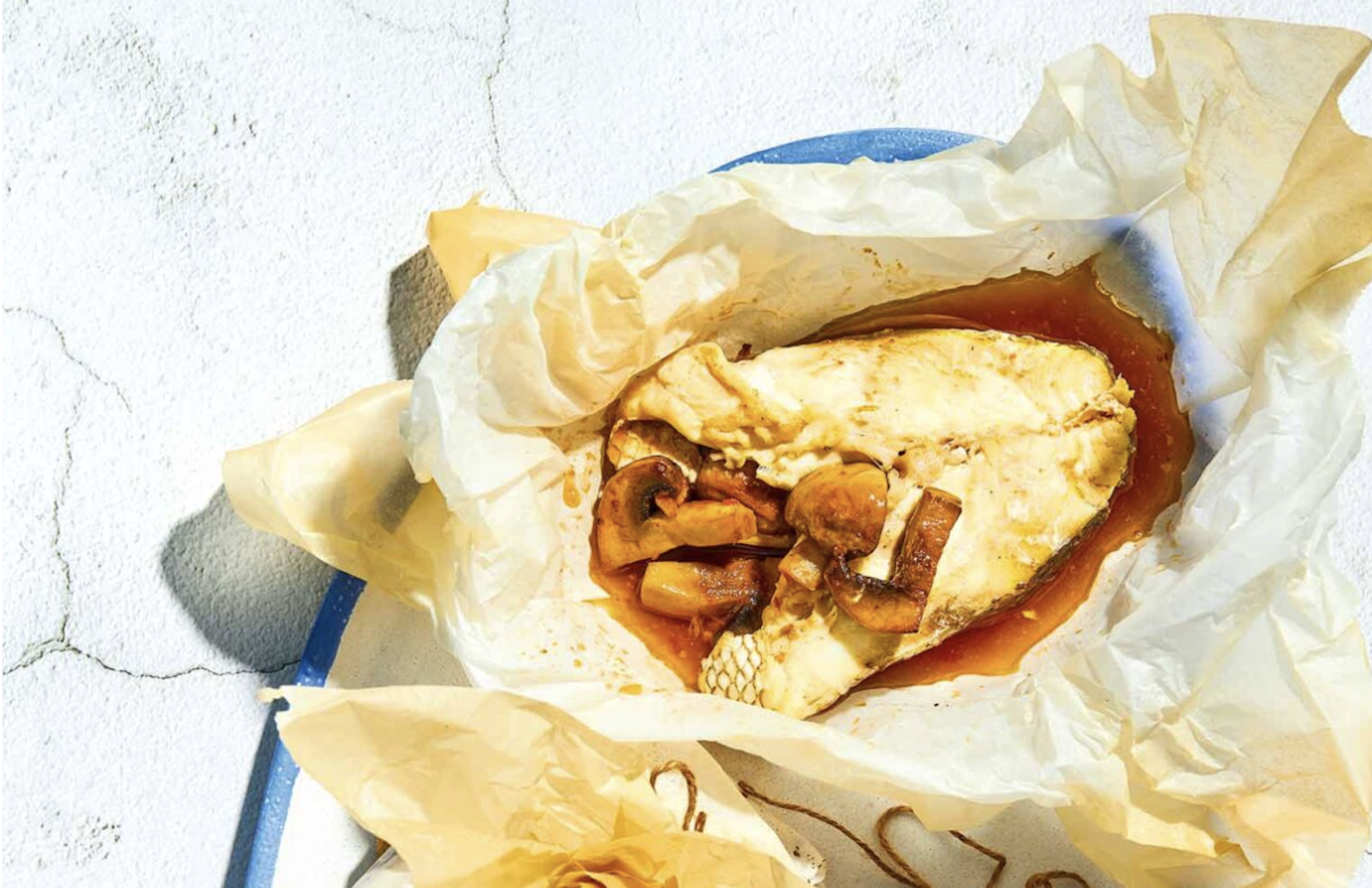 Τυλιγμένο στη λαδόκολλα, το φαγκρί γίνεται απίστευτα τρυφερό και ζουμερό και δεν κινδυνεύει να «στεγνώσει». Οι κόκκινες ντομάτες, τα γήινα μανιτάρια, το θυμάρι και ο δυόσμος, συνοδεύουν το ψάρι μοναδικά.