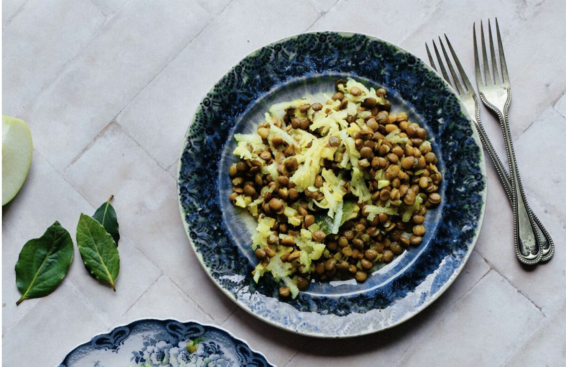Ένα εξαιρετικά ισορροπημένο πιάτο, μια που η γλυκόξινη γεύση του φρούτου εξισορροπεί τη γήινη, ξηροκαρπάτη γεύση του οσπρίου.