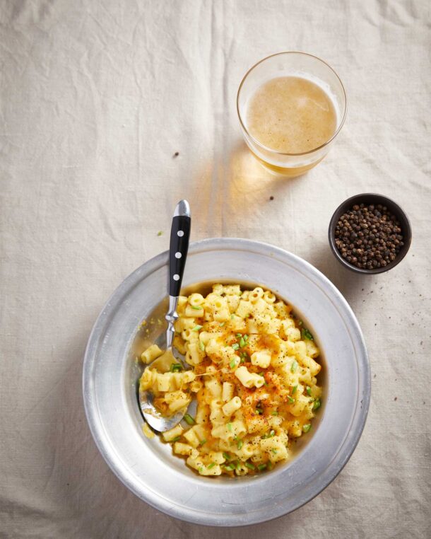 Ιδανικό ζυμαρικό είναι το κοραλλάκι, μικρόσχημο, λεπτό και καμπύλο. Εναλλακτικά χρησιμοποιούμε κοφτό μακαρονάκι. Εκτός από τσένταρ, που είναι το βασικό τυρί της συνταγής, θα βάλουμε και μείγμα τριμμένων μαλακών τυριών, που συνήθως βρίσκουμε έτοιμο στα σούπερ μάρκετ ή θα το φτιάξουμε εμείς ανακατεύοντας τυριά όπως γκούντα, ένταμ, κασέρι, μαλακή γραβιέρα σε ό,τι συνδυασμό μάς αρέσει.