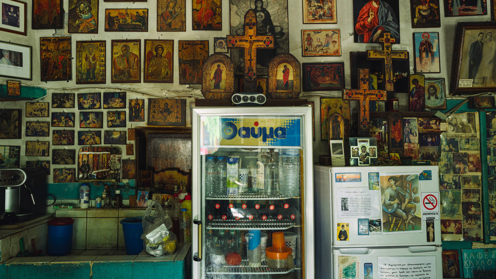Ογδόντα χρόνια καπηλειό στο ίδιο ακριβώς σημείο, μισοκρυμμένο πίσω από τη σγουρή φυλλωσιά μιας σχεδόν αιωνόβιας αγριοπιπεριάς. Εκεί βρήκαμε τον Κώστα, να αναπαύεται στη σκιά του ψηλού δέντρου, αναπόσπαστος, παρά τη φασαρία των τζιτζικιών, αφοσιωμένος να μελετά κείμενα της αρχαίας ελληνικής γραμματείας. Ο καφενές άνοιξε προπολεμικά από τους γονείς του Κώστα, τον Στέλιο και την Ειρήνη. «Εδώ μέσα έχουν γίνει μνημειώδεις παρέες», μας διηγείται. «Έφερναν στους γονείς μου λαγούς, ψάρια, όσπρια και ό,τι μπορούσαν να βρουν εκείνα τα χρόνια, κι εκείνοι έπιαναν και τα μαγείρευαν και γινόντουσαν σπουδαία συμπόσια κεκλεισμένων των θυρών. Να, δες στον τοίχο, όλες αυτές οι παλιές φωτογραφίες από τότε είναι. Από εδώ έχουν περάσει ποιητές, καθηγητές και διανοούμενοι, μεταξύ των οποίων ο συνθέτης και λογοτέχνης Γιώργος Σταυριανός, ο πολιτικός Κώστας Ζουράρις, ακόμα κι ο Αμερικανός Τζερόμ Μπρούνερ, ψυχολόγος ισάξιος του Φρόιντ! Περνώντας τα χρόνια, όλα αυτά ατόνησαν, μέχρι που εξαλείφτηκαν. Το πνεύμα που συνένωνε τις παρέες δεν υπάρχει πλέον».