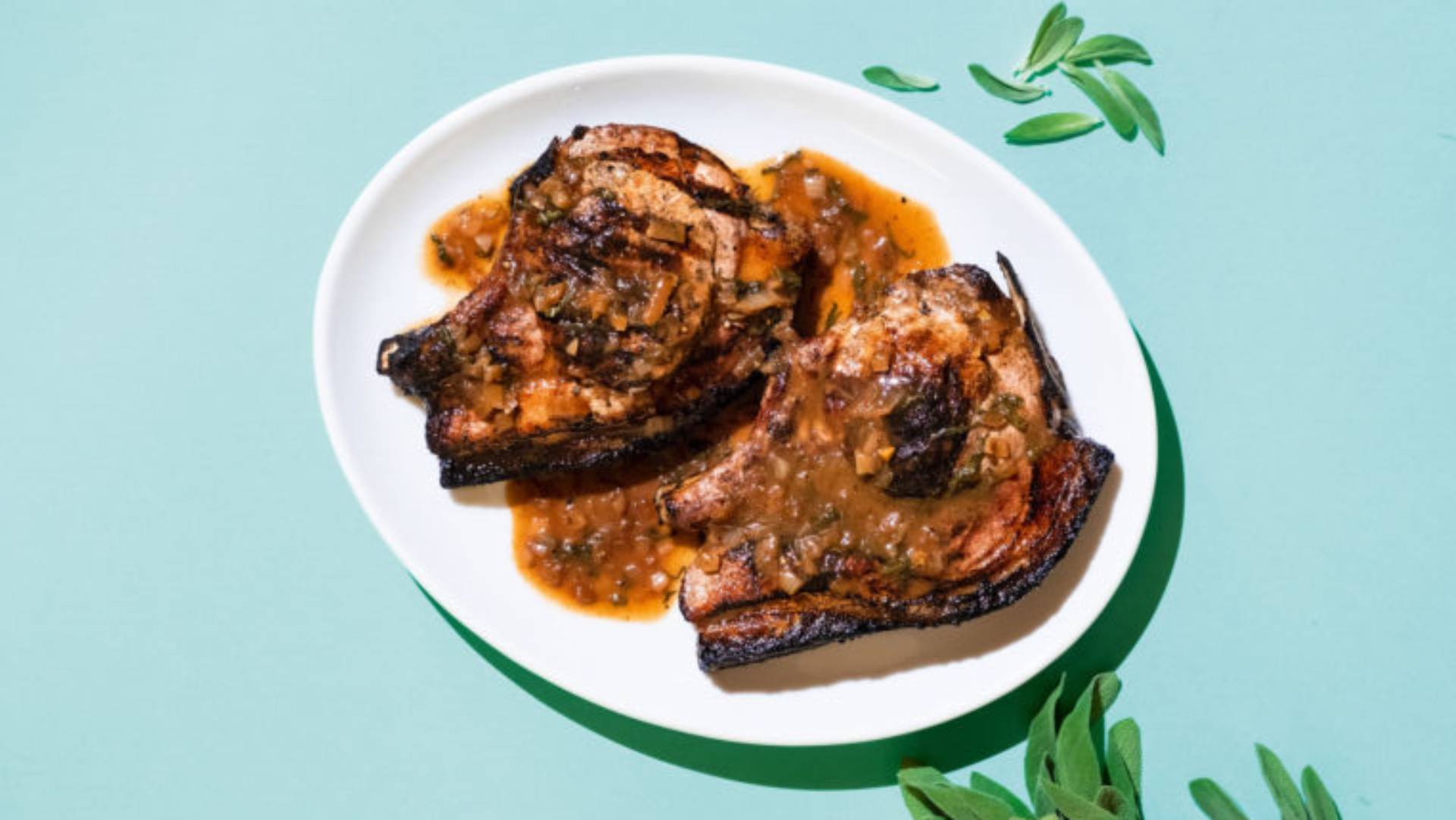 Δεν παίρνουν πάνω από 30 λεπτά αυτές οι ζουμερές χοιρινές μπριζόλες με μυρωδάτη σάλτσα ξιδιού και φασκόμηλο.