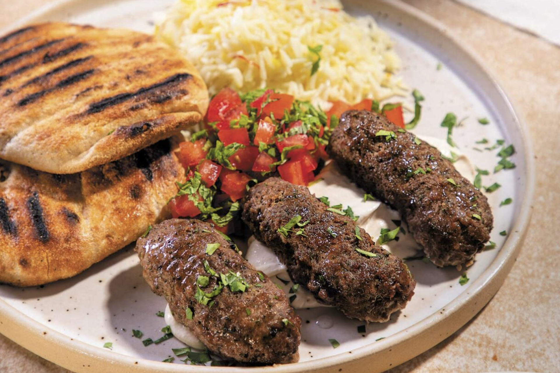 Εύκολη και γρήγορη συνταγή για λιβανέζικο, αρωματικό κεμπάπ από μοσχαρίσιο και αρνίσιο κιμά. Σερβίρουμε με αραβικές πίτες, ντομάτα και γιαούρτι για ένα ολοκληρωμένο γεύμα.