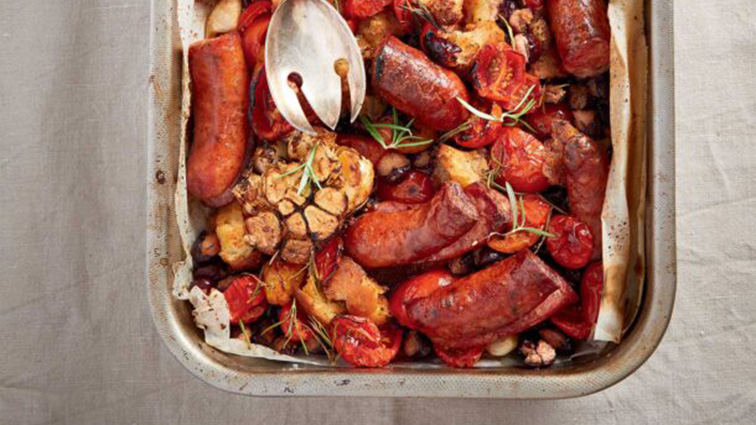 Ψήνουμε για περίπου 40 λεπτά, μέχρι να ψηθούν καλά όλα τα υλικά, να ροδοκοκκινίσουν τα λουκάνικα και να μελώσουν τα ντοματίνια και τα φασόλια.