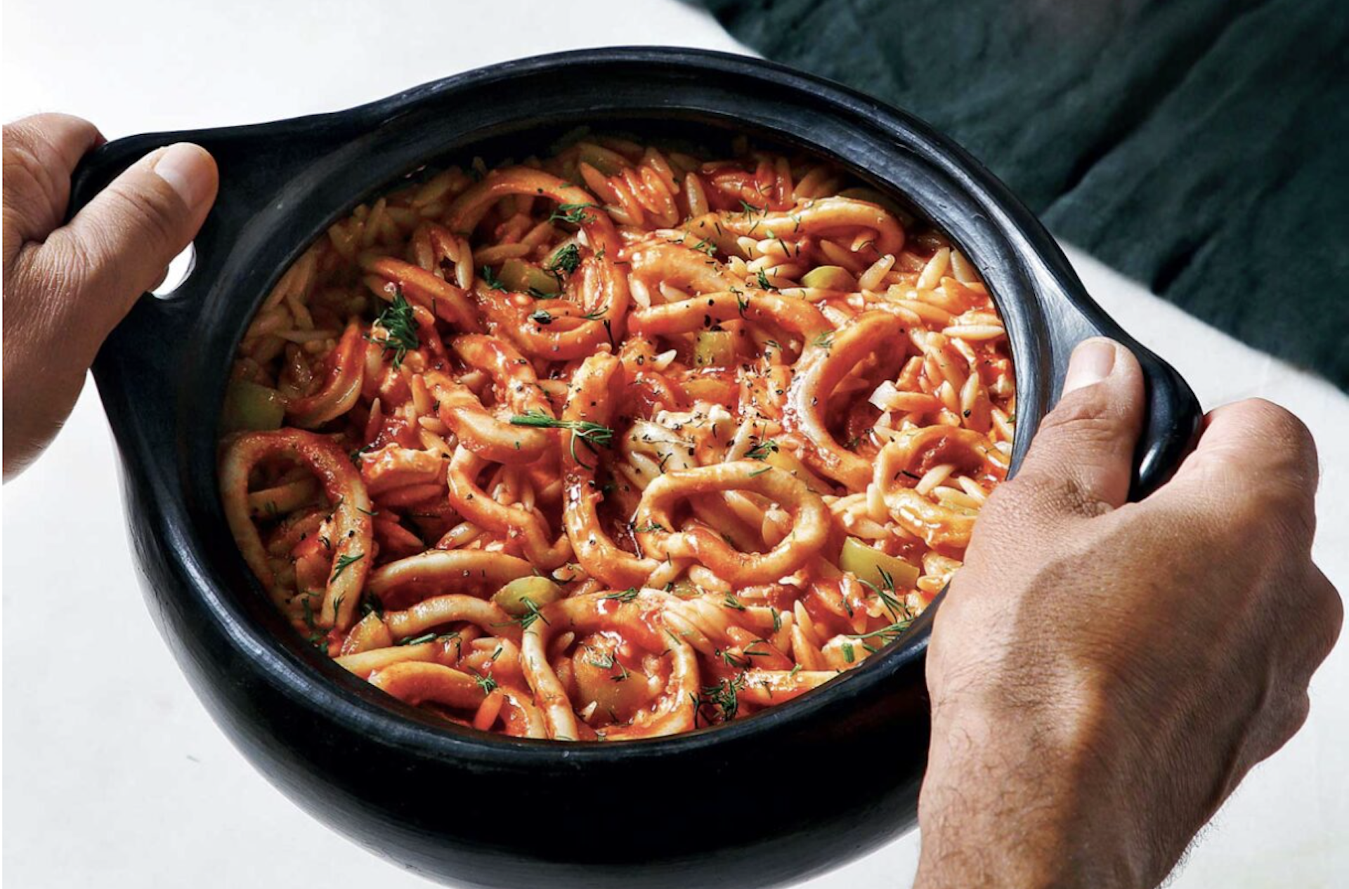Μελωμένο φαγάκι με λαχταριστά καλαμαράκια, πλούσια ντοματένια σάλτσα μαγειρεμένα με κριθαράκι και μπόλικη φέτα.