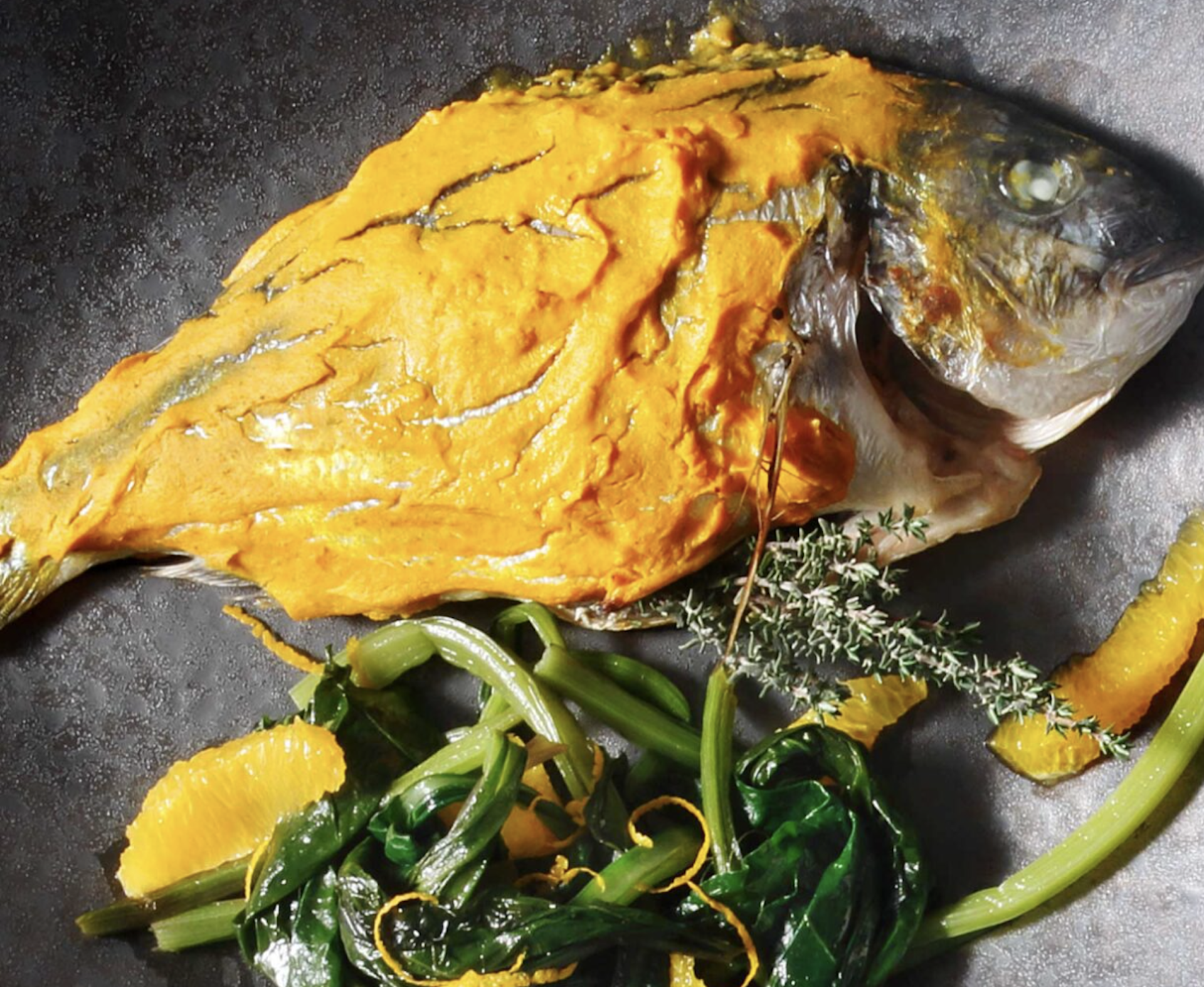 Ένας διαφορετικός τρόπος να μαγειρέψουμε την τσιπούρα. Πριν βάλουμε το ψάρι στο φούρνο, το αλείφουμε με μια πυκνόρρευστη, λεμονάτη μαρινάδα από καρότο, δημιουργώντας μια νόστιμη κρούστα.