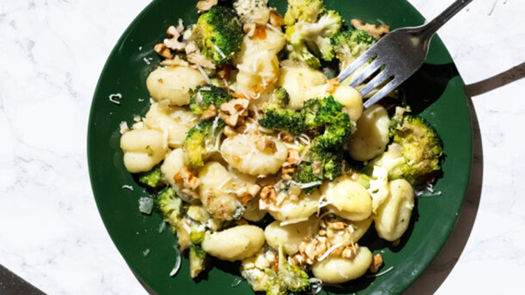 Ένα πρωτότυπο και γρήγορο πιάτο με νιόκι. Το μπρόκολο ταιριάζει γάντι με το πικάντικο τυρί και τα καρύδια.