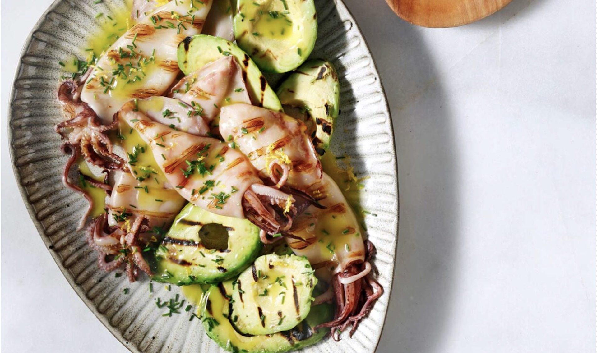 - Μοιράζουμε το αβοκάντο στα πιάτα και από πάνω βάζουμε τα καλαμάρια.