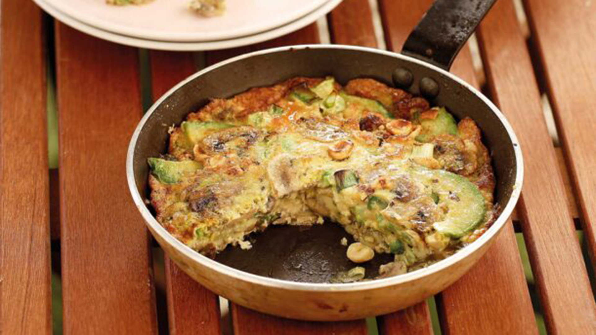 - Συνοδεύουμε, την ομελέτα με παρμεζάνα, μανιτάρια, φουντούκια και αβοκάντο, με σαλάτα με ντοματίνια, ελιές, φέτα και παξιμάδια από χαρούπι.