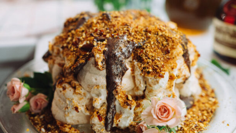 - Τελειώνουμε στολίζοντας με λίγη σοκολάτα λιωμένη και τα κομμάτια με τα καραμελωμένα αμύγδαλα που είχαμε φυλάξει.