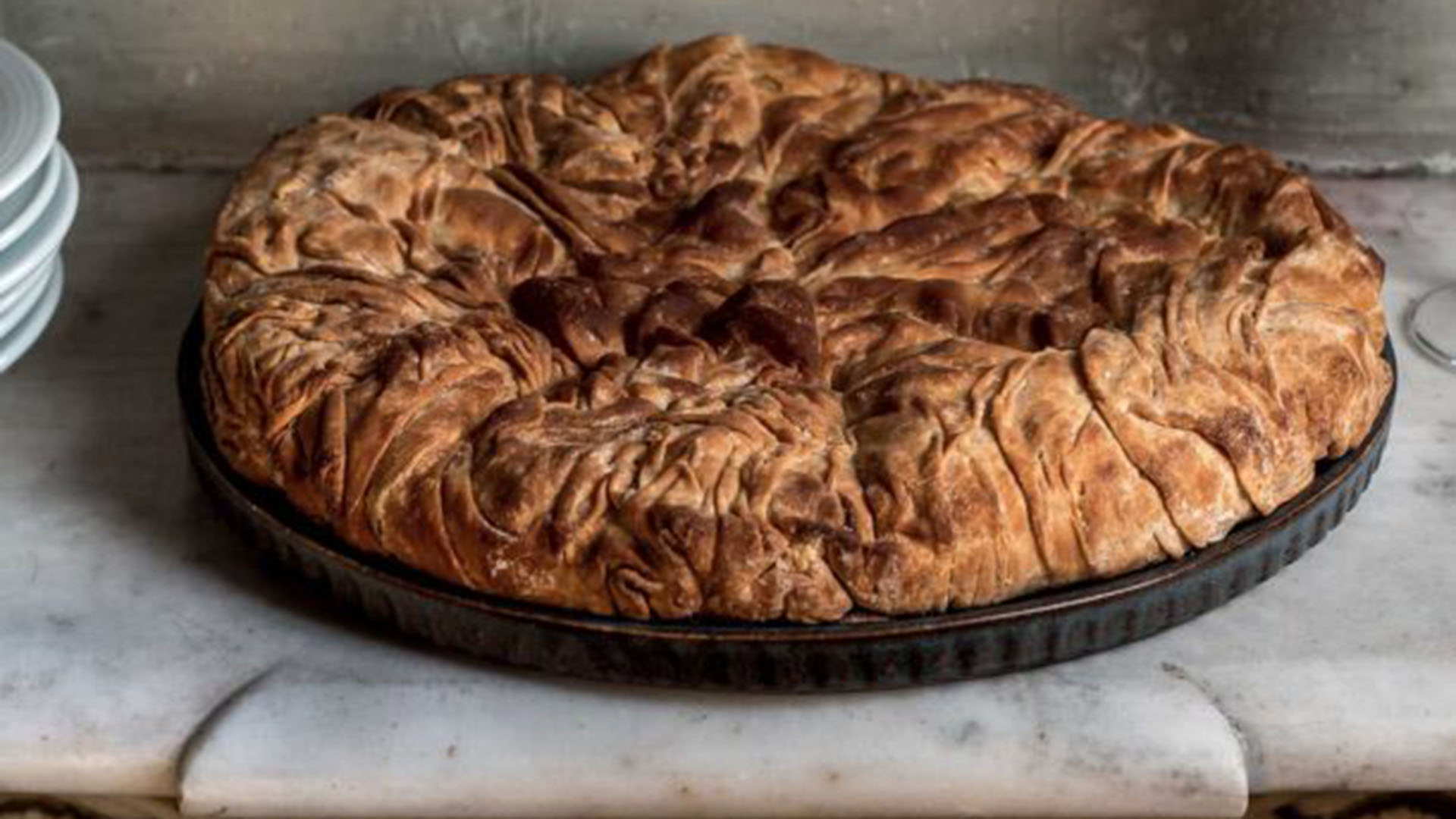 - Το βουτυρώνουμε και καλύπτουμε με το τελευταίο φύλλο, επίσης τσαλακωμένο και βουτυρωμένο. Γυρίζουμε τις άκρες των φύλλων προς τα κάτω για να κλείσουμε καλά τη γέμιση και ψήνουμε την πίτα για περίπου 1 ώρα σε χαμηλό ράφι στον φούρνο, μέχρι να ροδίσει και να ψηθεί και από κάτω.
