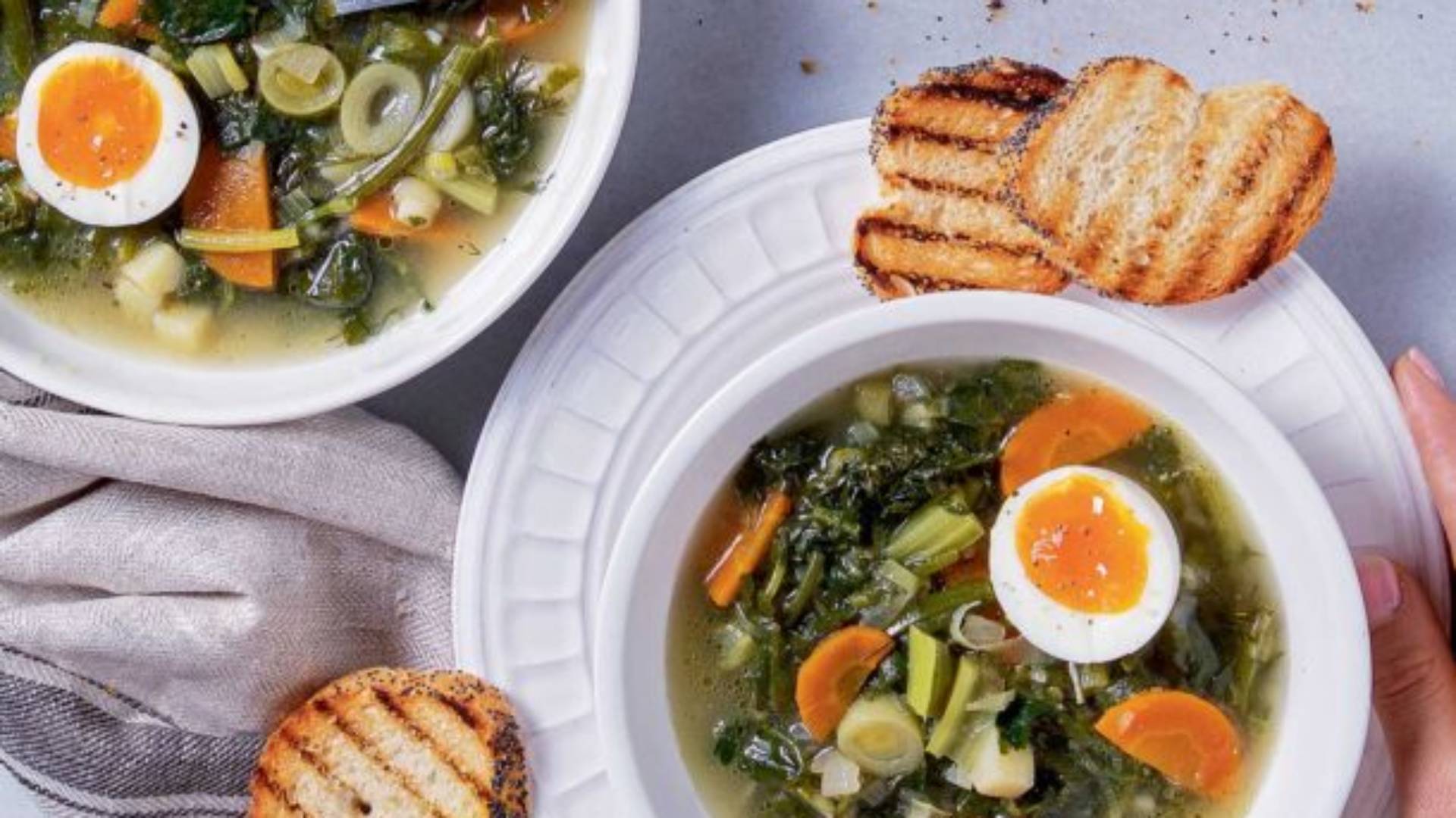 Μπορούμε, αν θέλουμε, να πολτοποιήσουμε τη σούπα για ένα βελούδινο αποτέλεσμα. Με τα ψιλοκομμένα χορταρικά, όμως, έχει μια πιο ρουστίκ όψη και ξεχωρίζουμε στο στόμα τη γεύση και την υφή τους. Αντί για μελάτο αυγό, μπορούμε να βάλουμε κυβάκια γραβιέρας σαγανάκι ή ένα καλά σοταρισμένο αλλαντικό.