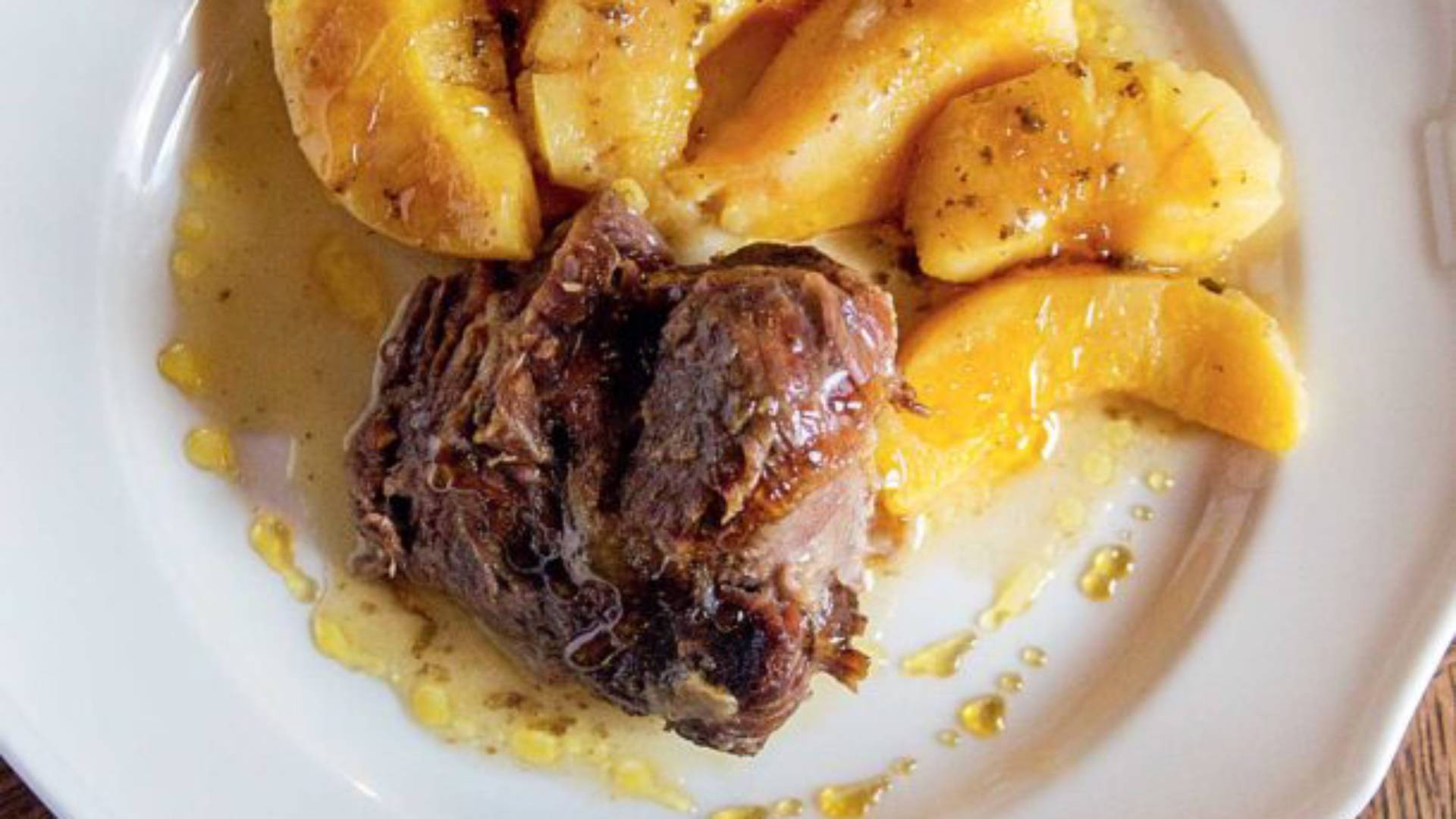- Μοιράζουμε το φαγητό στα πιάτα και προσθέτουμε πάνω από τα κυδώνια και το μοσχάρι μια μικρή ποσότητα καραμέλας.