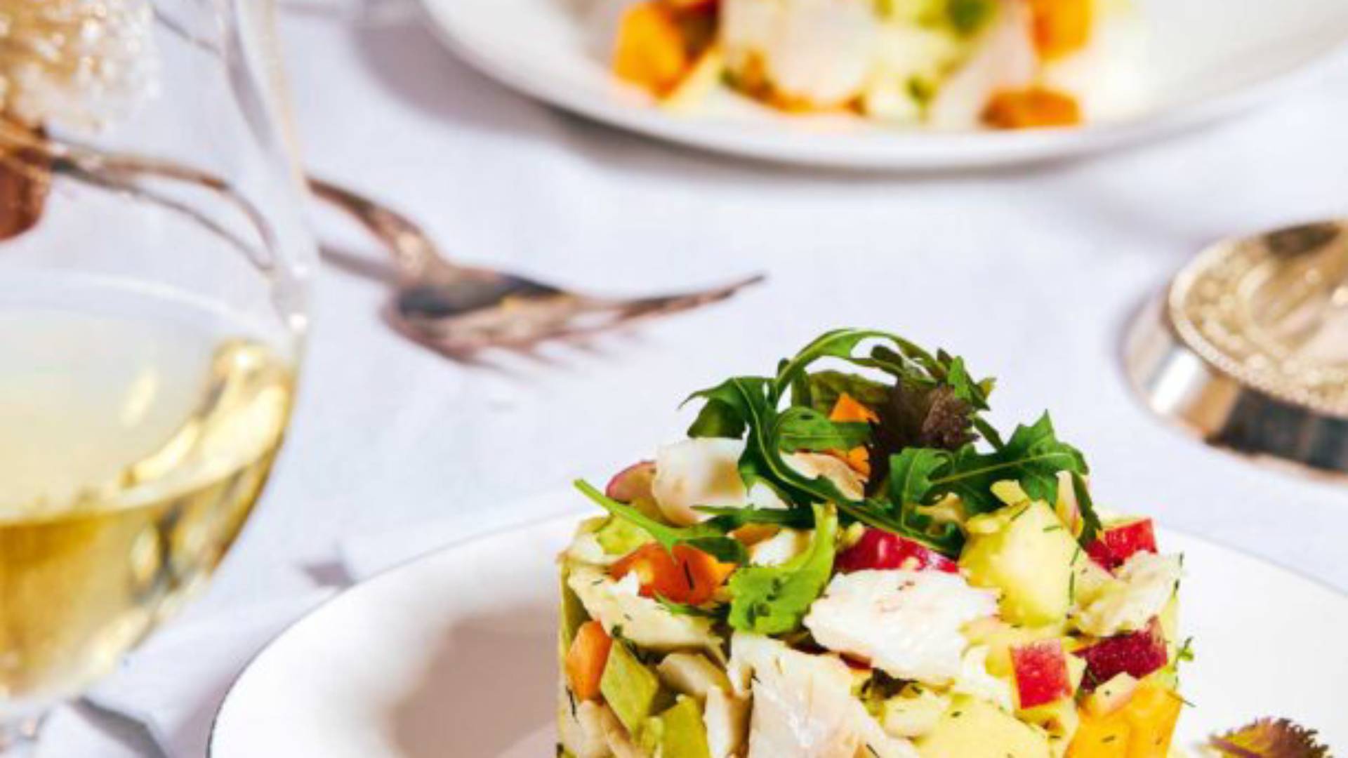 Το αγαπημένο πιάτο της ελληνικής αστικής κουζίνας, η αθηναϊκή, σε μια διαφορετική εκδοχή. Το ψάρι συνδυάζεται με ωμά λαχανικά και μήλα, και μια πολύ γευστική «μαγιονέζα» αβοκάντο.