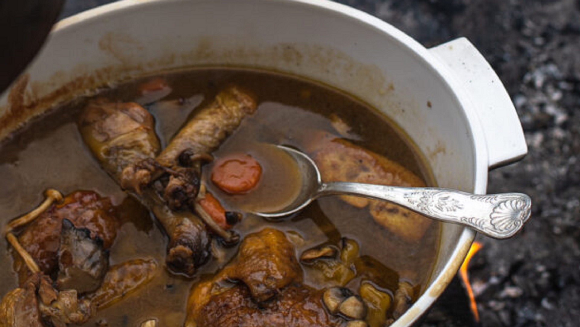 Ο σεφ Σωτήρης Ευαγγέλου τούτη τη συνταγή, στην οποία το πολύ νόστιμο πουλερικό συναντά πολλά και διάφορα μανιτάρια, λευκά, πλευρώτους, πορτομπέλο (μπορούμε να βάλουμε και άλλα, αν έχουμε), μας τη μαγείρεψε σε μια πλαγιά του Ολύμπου, στα Πριόνια, ψηλά στα 1.000 μέτρα. Και στήσαμε τρανή γιορτή σε μπακιρένια πιάτα.