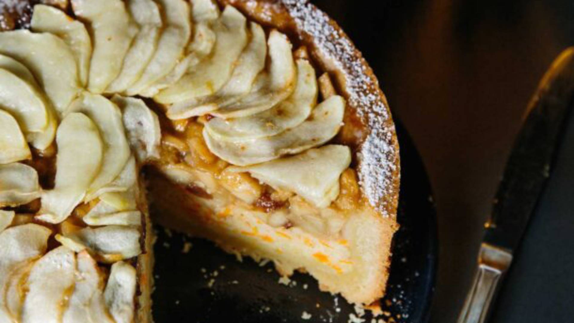 - Καθαρίζουμε και κόβουμε το μήλο σε λεπτές ομοιόμορφες φέτες και τις τακτοποιούμε σαν βεντάλια στην επιφάνεια της τάρτας. Ψήνουμε για 45-50 λεπτά.