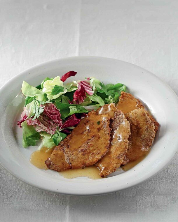 Το κρασί και η μουστάρδα δένουν στο τηγάνι και δημιουργούν μια γρήγορη σάλτσα για τα σκαλοπίνια.