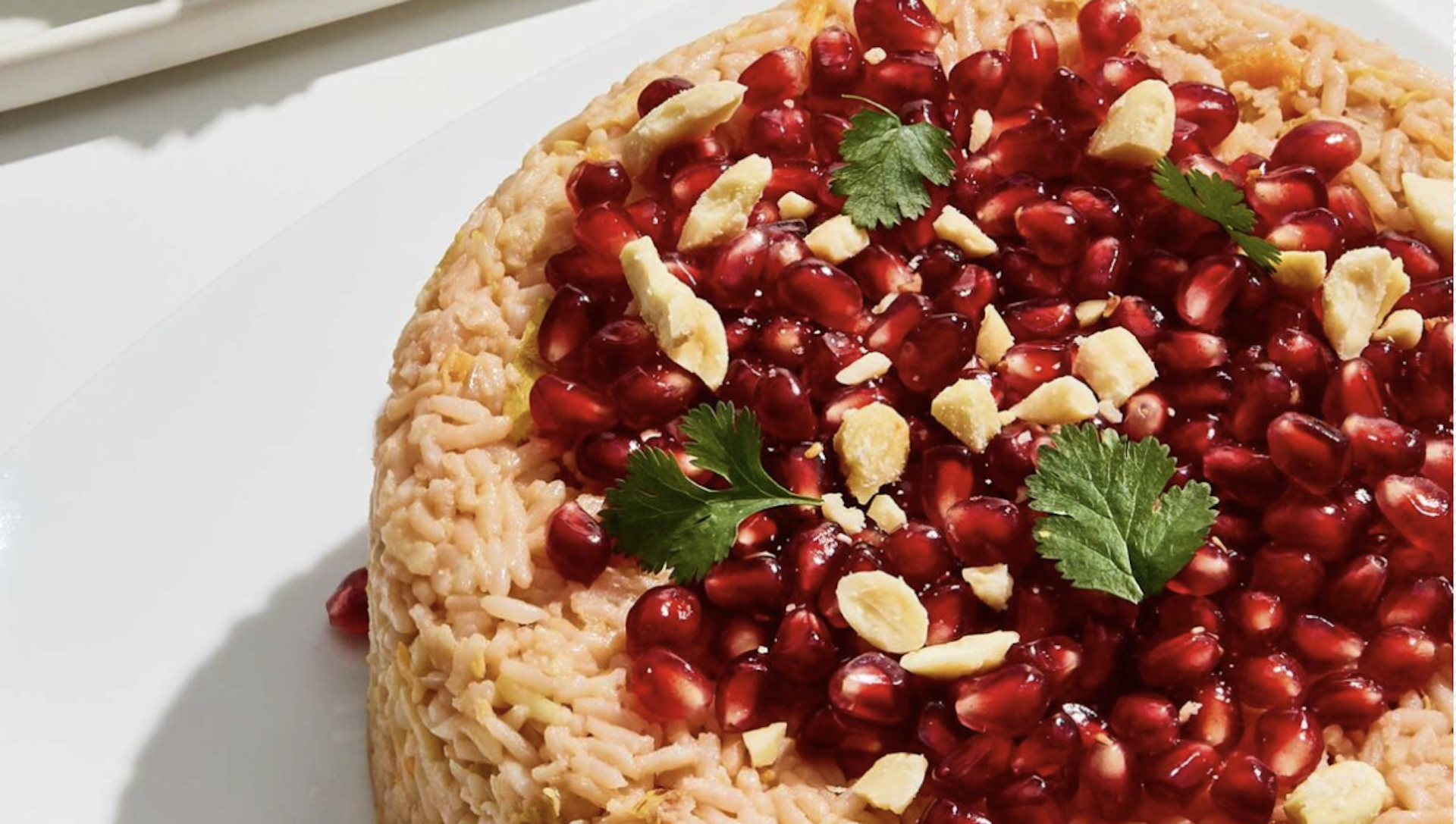 - Αναποδογυρίζουμε σε πιατέλα και γαρνίρουμε με τα αμύγδαλα, το ρόδι και τον κόλιανδρο.