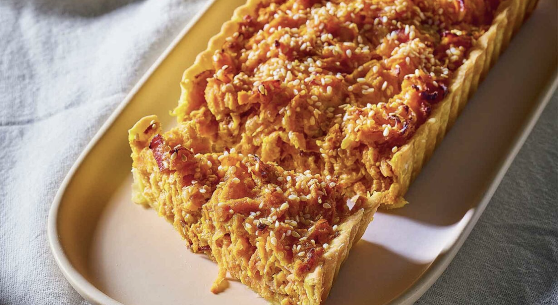 Το μπέικον και το τζίντζερ ταιριάζουν τέλεια με την κολοκύθα. Σερβίρουμε την τάρτα ως πρώτο πιάτο σε γιορτινά τραπέζια.