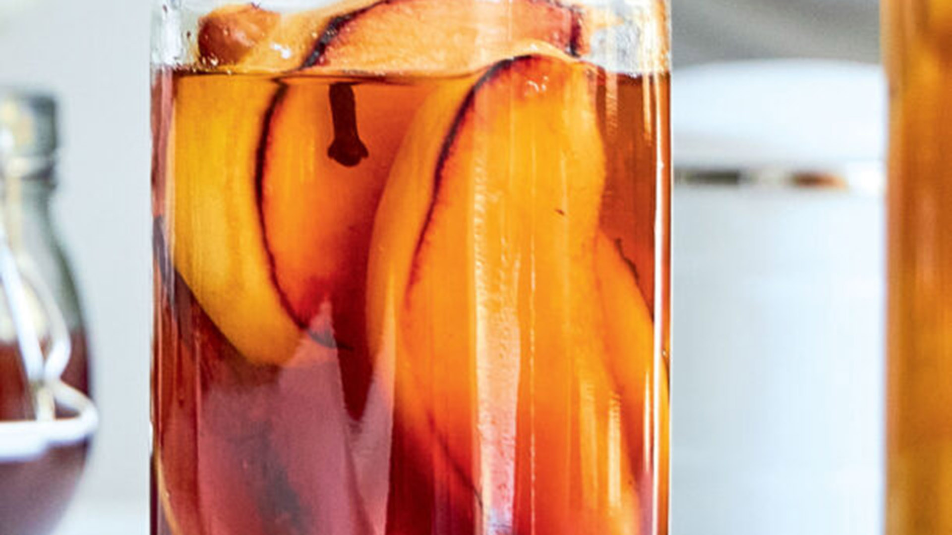 - Σβήνουμε με το ποτό, χαμηλώνουμε τη φωτιά και σιγοβράζουμε για περίπου 15 λεπτά, μέχρι να μαλακώσουν. Τα βγάζουμε από το τηγάνι με τρυπητή κουτάλα και τα μεταφέρουμε στο δοχείο όπου θα τα φυλάξουμε (γυάλινο τάπερ ή μικρή γυάλα).