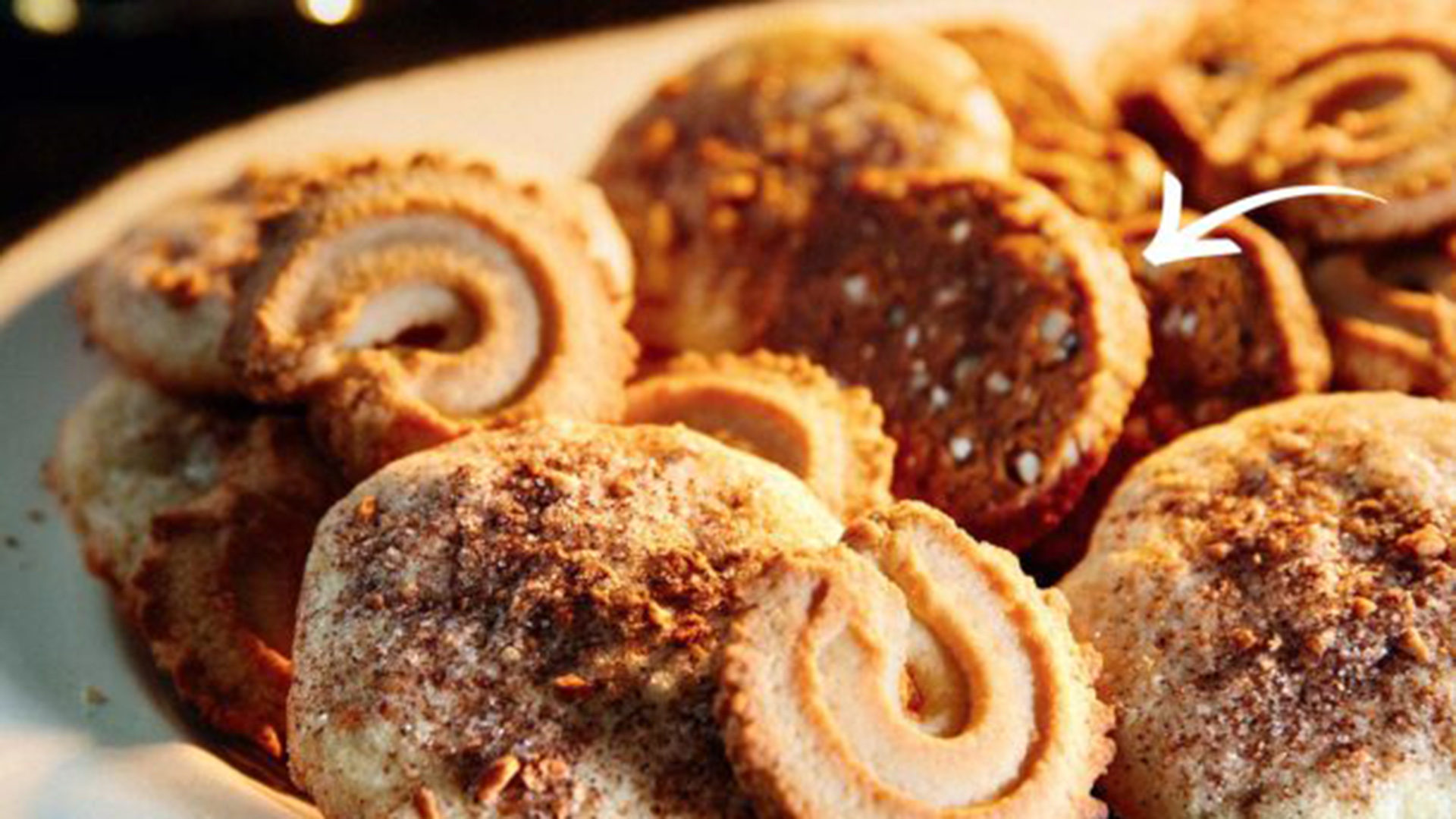 - Βγάζουμε τη ζύμη από το ψυγείο και κόβουμε το μπαστούνι σε πολύ λεπτές φέτες. Τακτοποιούμε τα μπισκότα στο ταψί και ψήνουμε για 6-7 λεπτά (προσοχή, δεν πρέπει να σκουρύνουν). Ξεφουρνίζουμε και τα αφήνουμε να κρυώσουν.