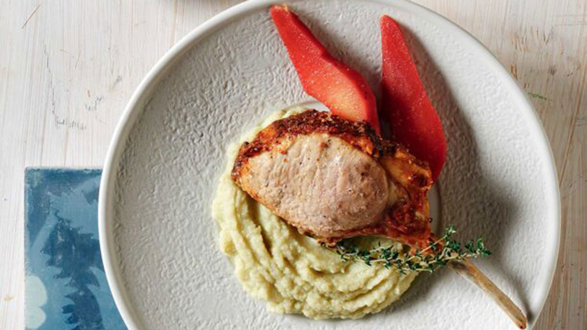 Αν ψάχνετε μια ιδιαίτερη συνταγή για ένα γιορτινό κάλεσμα στο σπίτι, τη βρήκατε. Ενα μεταμορφωμένο χοιρινό πρασοσέλινο: φουρνιστό καρέ γουρουνόπουλου με αφράτο πουρέ, ψητά κυδώνια και σάλτσα σκόρδου.