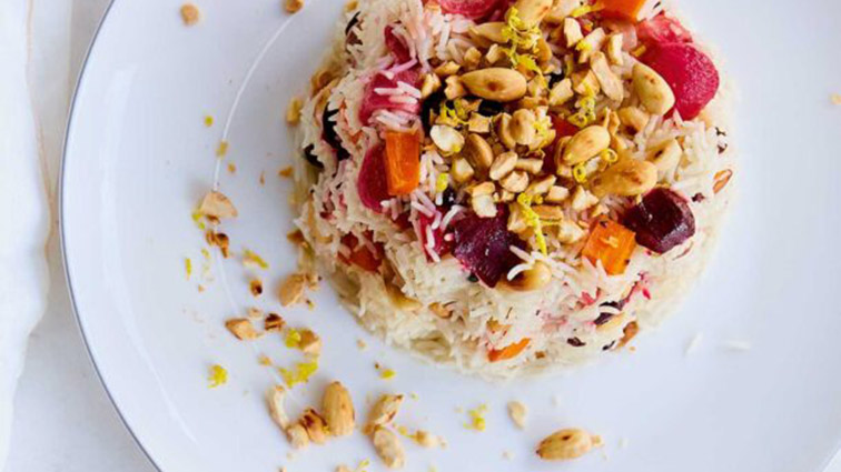 - Ξεφορμάρουμε το πιλάφι σε πιατέλα, σκορπίζουμε από πάνω τα υπόλοιπα αμύγδαλα και σερβίρουμε.