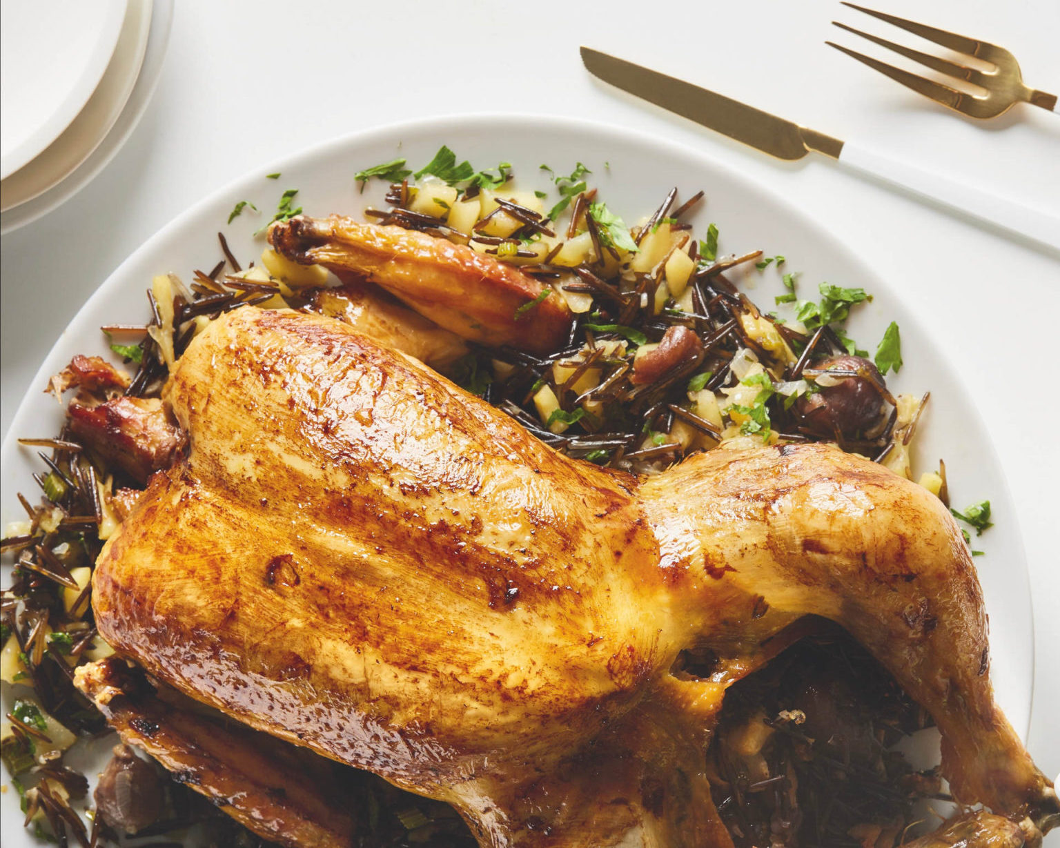 Μπορούμε να το φτιάξουμε με κόκορα ή καπόνι. Το ζουμερό κρέας, η γέμιση με μήλα, κάστανο και άγριο ρύζι και η πλούσια σάλτσα δένουν σε ένα ξεχωριστό φαγητό με γήινες νότες που μυρίζει γιορτή.