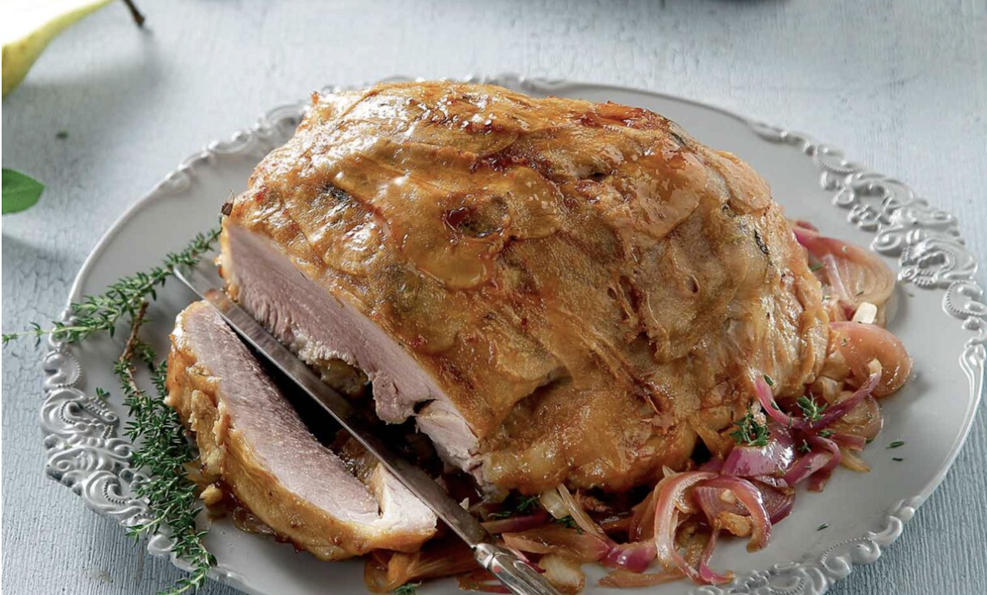 Ένα εξαίσιο χοιρινό μπούτι για το γιορτινό ή το κυριακάτικο τραπέζι που μαρινάρεται για ένα βράδυ και όταν ψήνεται γίνεται μαλακό και πεντανόστιμο, θα σας ξαφνιάσει το πόσο πολύ ταιριάζει με τα αχλάδια.
