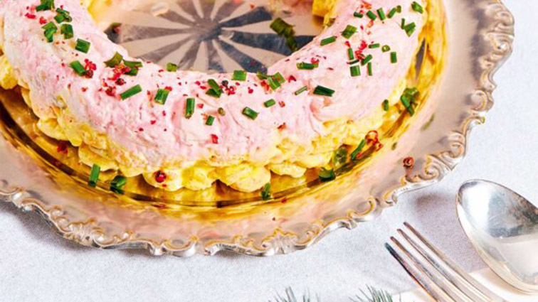 - Βάζουμε στο ψυγείο για 30 λεπτά και ξεφορμάρουμε σε πιατέλα, έτσι ώστε το ροζέ μείγμα της μαγιονέζας παντζαριού να βρεθεί από πάνω.