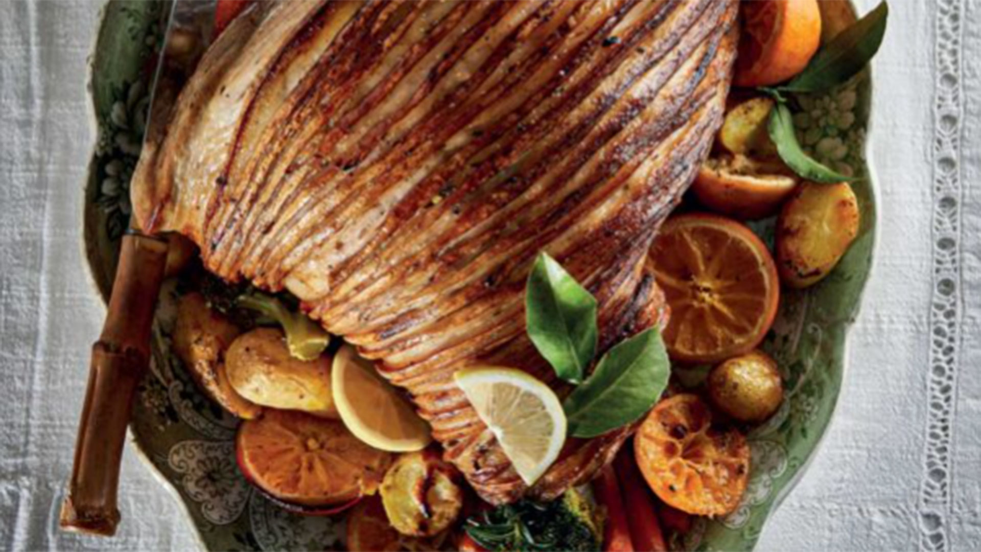 Ολόκληρο χοιρινό μπούτι με κρασί, πορτοκάλι και ξερά φρούτα