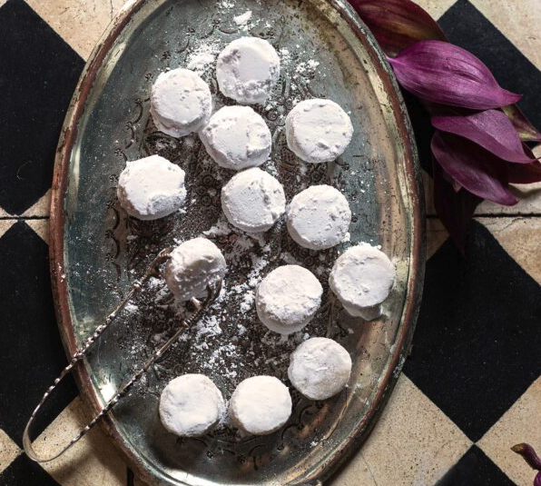- Αναμειγνύουμε την αμυγδαλόσκονη με τη ζάχαρη άχνη και το ροδόσταγμα, τα ανακατεύουμε καλά και πλάθουμε 50 μικρά μπαλάκια.