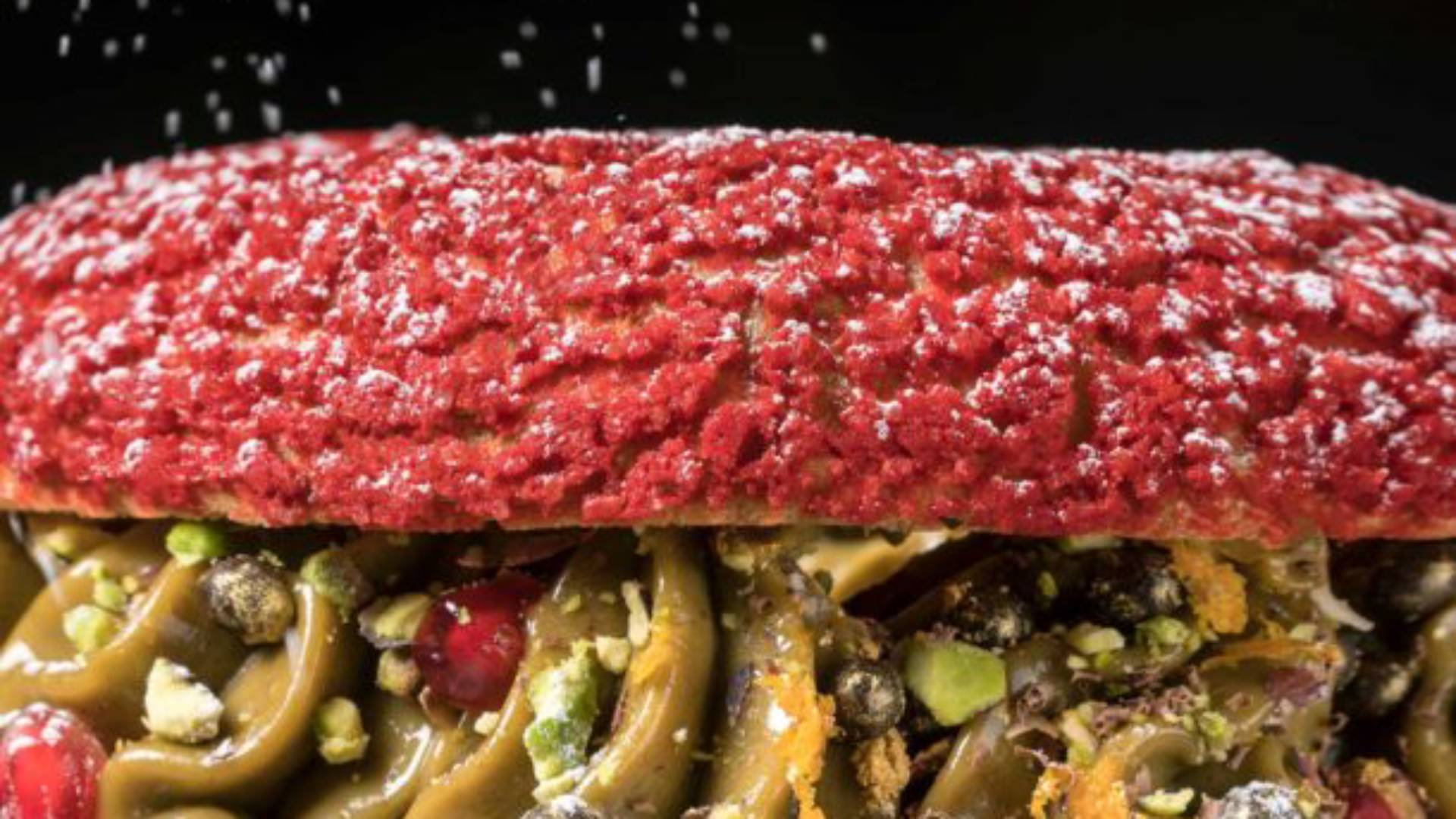 - Για να φτιάξουμε Paris-Brest κατακόκκινο, σαν χριστουγεννιάτικο στολίδι, ξεκινάμε με τη κόκκινη κρούστα, ξεκινάμε χτυπώντας στο μίξερ, με το φτερό, τη ζάχαρη, το χρώμα και το αλεύρι. Προσθέτουμε το βούτυρο και χτυπάμε μέχρι να έχουμε μια εύπλαστη κόκκινη ζύμη.