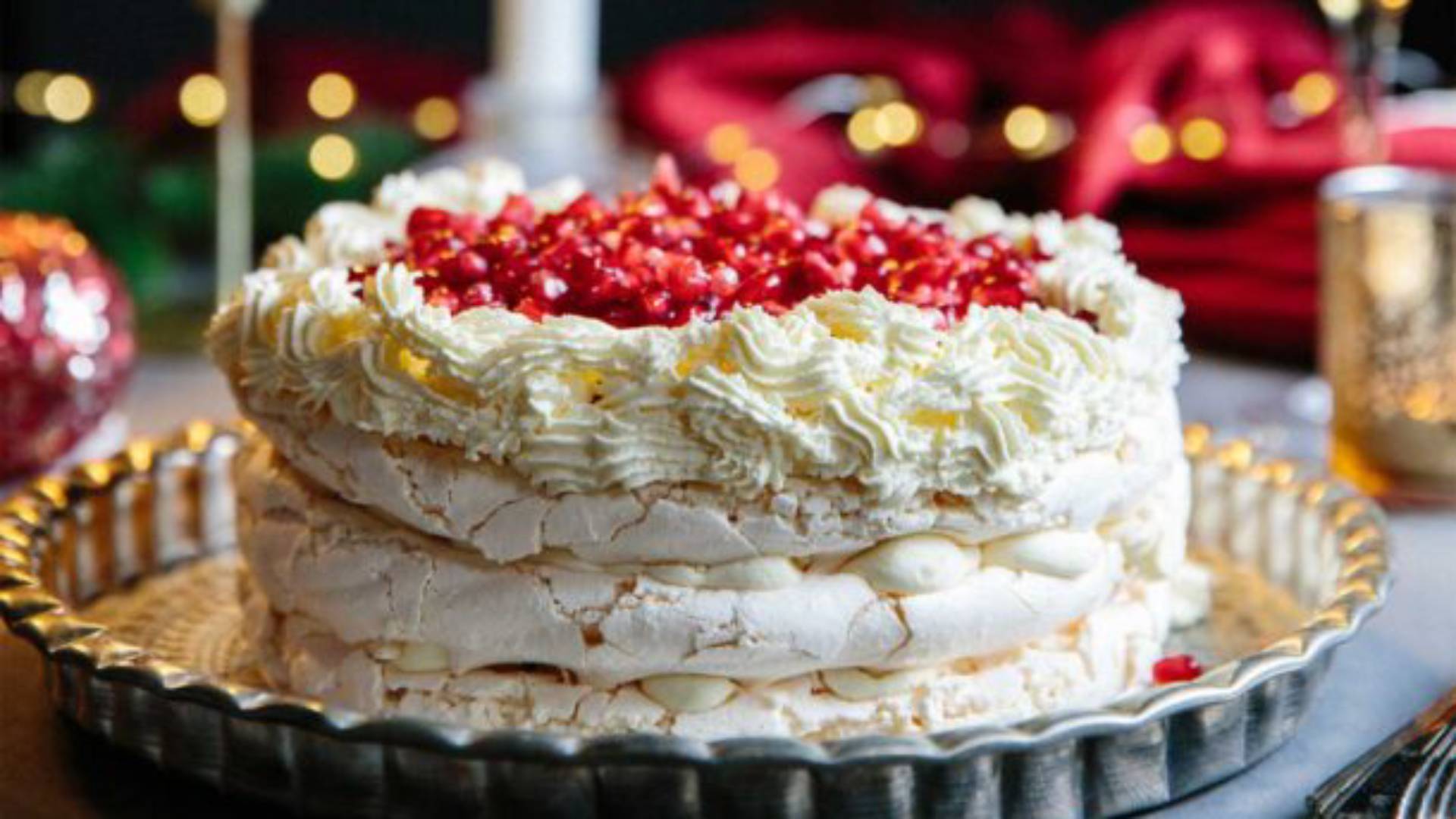 - Για να φτιάξουμε τη πάβλοβα με ρόδι, ξεκινάμε προθερμαίνοντας τον φούρνο στους 90°C στη λειτουργία του αέρα και στρώνουμε ένα ρηχό ταψί με λαδόκολλα.