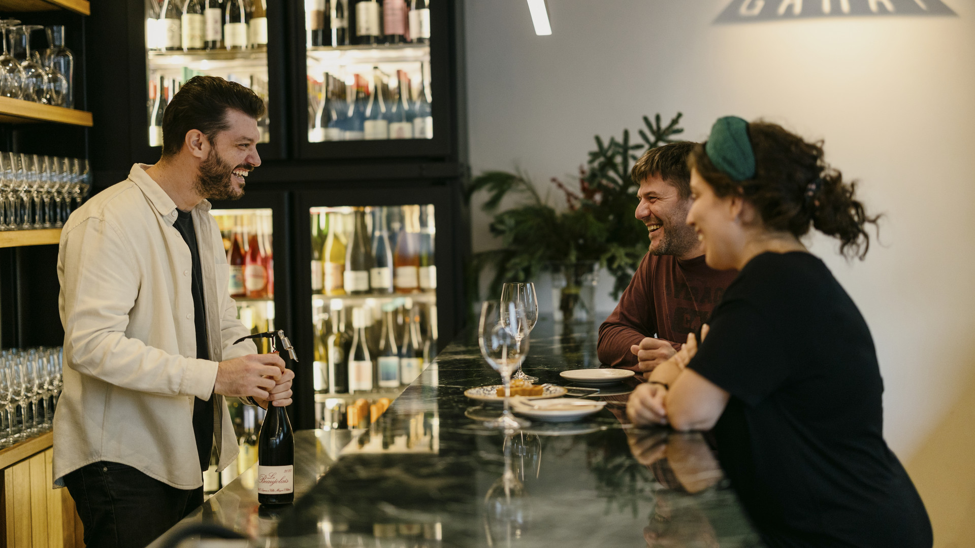 Όταν τελείωσε η συνεργασία του με το Mr. Vertigo, προέκυψε η συμμετοχή του σε ένα νέο πρότζεκτ. Μαζί με τους Θοδωρή Αλεξάκη και Αλέξανδρο Παπαδόπουλο έστησαν ένα wine bar σε ένα κτίριο στολίδι. «Το ακίνητο του 1929, με αρχιτεκτονική Bauhaus, ζητούσε από την πρώτη στιγμή να σώσουμε όσο περισσότερα μπορούσαμε από την πρότερη ζωή του» λέει ο interior designer Μάρκος Μαραμπώτος που διατήρησε τα βασικά στοιχεία του χώρου, την ζηλευτή είσοδο του ισογείου κτίσματος αλλά και το πάτωμα, με τα σχεδόν αιωνόβια πλακίδια στα χρώματα της τερακότας και της ώχρας. Όλο το μαγαζί είναι η μπάρα του: πράσινο τηνιακό μάρμαρο, ακουμπάει πάνω σε μια βάση, ένα στιβαρό τείχος από ασοβάτιστα τούβλα, μια επιτυχημένη αντίθεση πολυτέλειας και βιομηχανικού design.