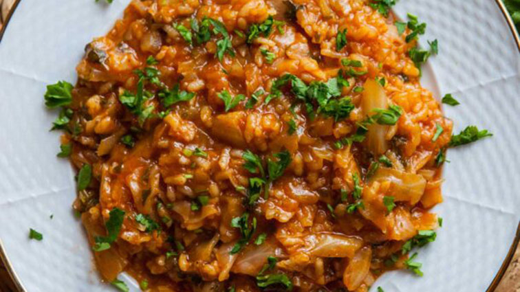 - Μετά προσθέτουμε τον πελτέ διαλυμένο σε 1/2 φλιτζάνι νερό, τα μπαχαρικά και το ρύζι. Για να γίνει το ρύζι, πρέπει η κατσαρόλα να έχει περίπου 3 φλιτζάνια υγρό. Υπολογίζουμε περίπου πόσο λείπει, προσθέτουμε όσο χρειάζεται και μαγειρεύουμε μέχρι σχεδόν να γίνει το ρύζι.