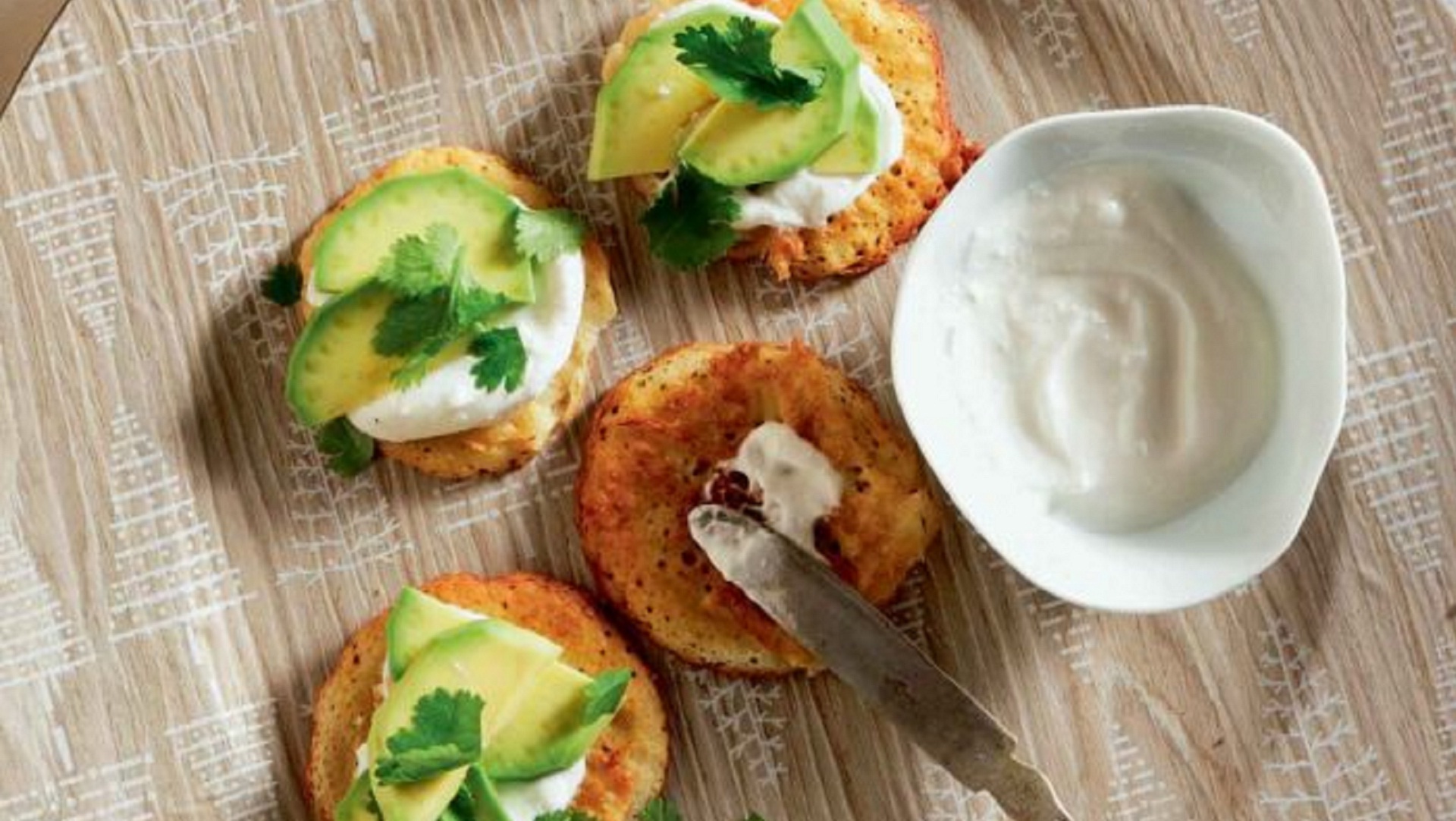 Κόβουμε σε φέτες τα αβοκάντο. Αλείφουμε τις τηγανίτες με γαλοτύρι μοιράζουμε το αβοκάντο, περιχύνουμε με λίγο χυμό λάιμ και ελαιόλαδο.