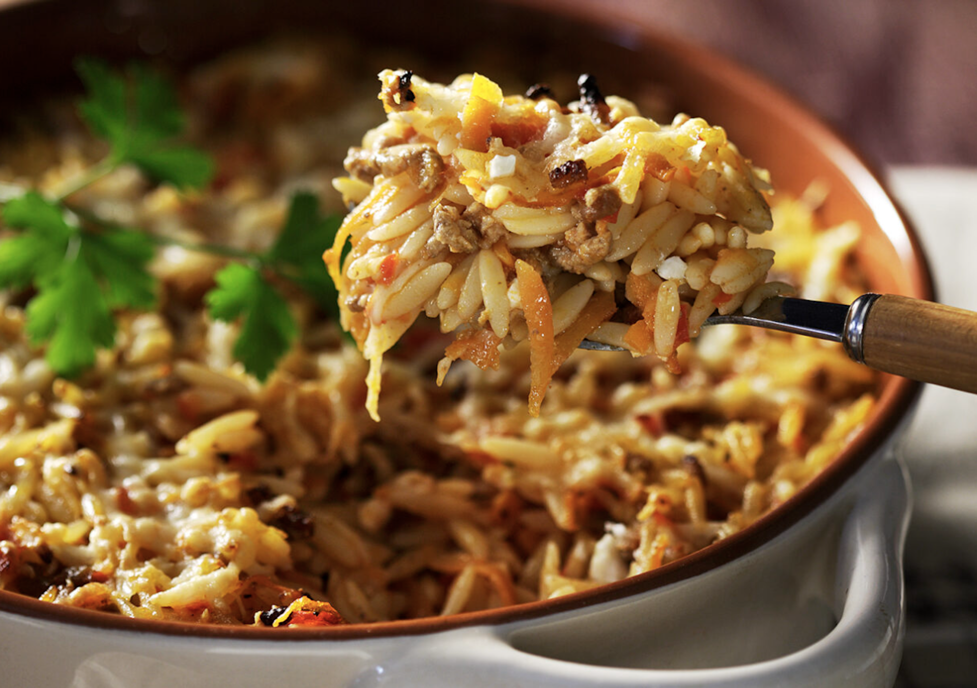 - Πασπαλίζουμε με το υπόλοιπο τριμμένο κεφαλοτύρι και ψήνουμε για 30 λεπτά, μέχρι να γίνει το κριθαράκι και να αποκτήσει μια ρόδινη κρούστα.