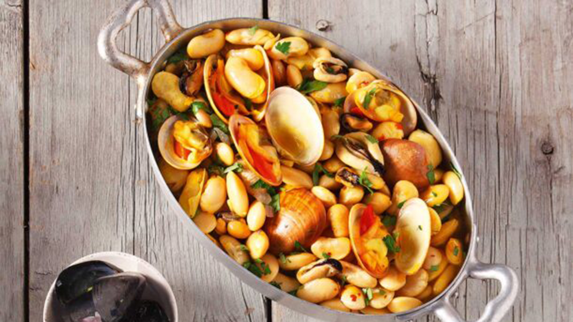 Είναι μια παραλλαγή των fabes con almejas, μιας παραδοσιακής συνταγής της περιοχής Αστούριας της Ισπανίας. Αν δεν βρείτε κάποιο από τα οστρακοειδή που προτείνουμε, μπορείτε να βάλετε άλλα της αρεσκείας σας ή να χρησιμοποιήσετε μόνο ένα είδος. Ελαφρώς πολύπλοκο το μαγείρεμα του συγκεκριμένου φαγητού, θα σας αποζημιώσει όμως με τη νοστιμιά και την πρωτοτυπία του.