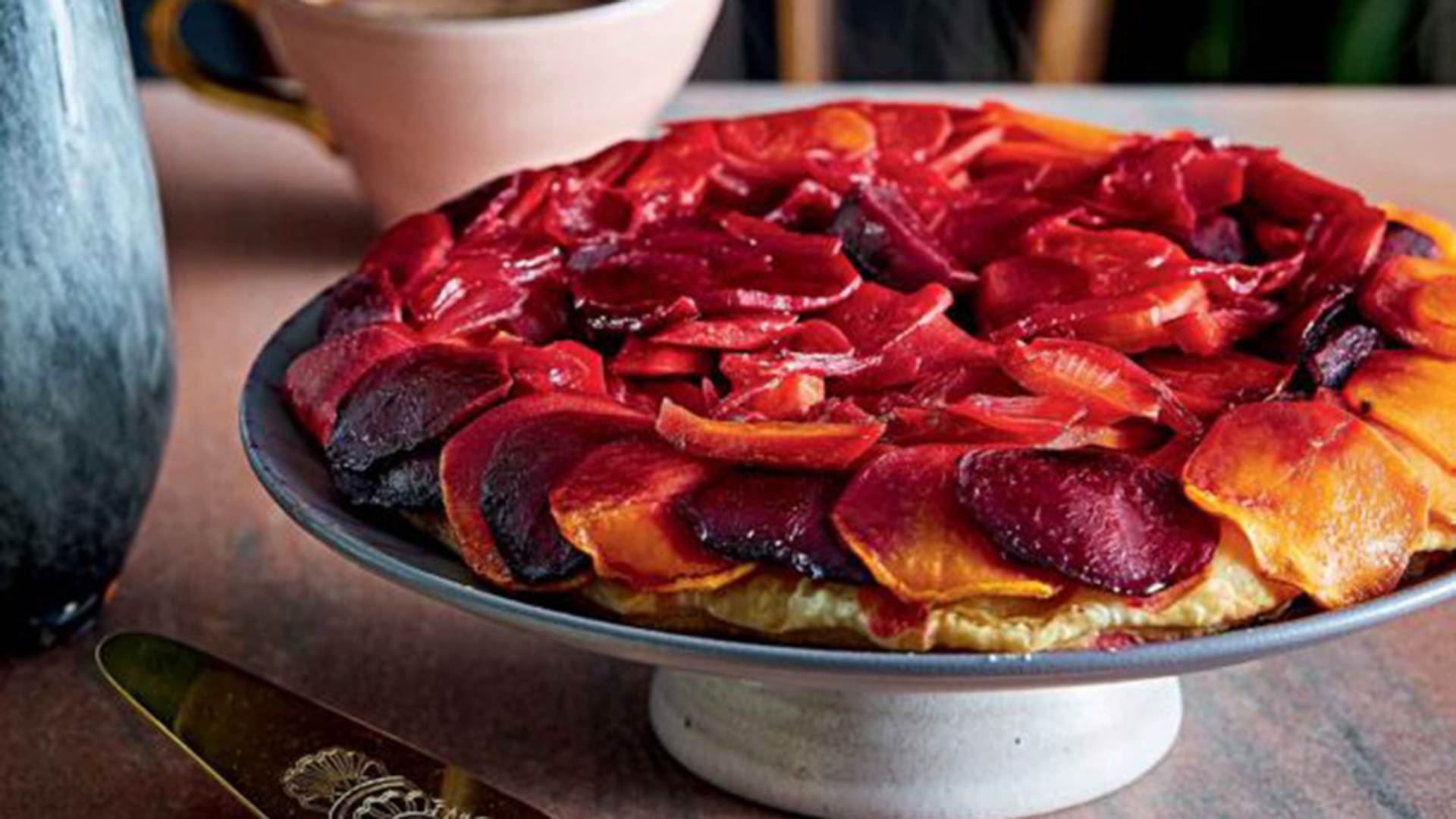 Οι γλυκοπατάτες και τα παντζάρια με τα έντονά χρώματά τους χαρίζουν όχι μόνο εντυπωσιακή εμφάνιση αλλά και απίθανη γεύση σε αυτή την εύκολη, ανάποδη τάρτα. Ωραία ιδέα για μπουφέ ή για ελαφρύ γεύμα, μαζί με μια πράσινη σαλάτα. Βάλτε τη δίπλα σε πλατό τυριών και ανοίξτε το αγαπημένο σας μπουκάλι κρασί.