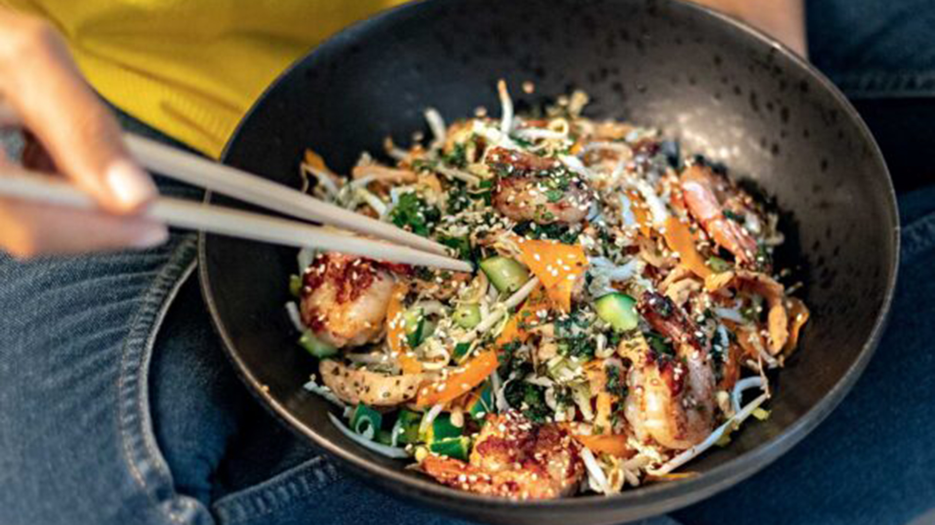 - Σκουπίζουμε το τηγάνι και ζεσταίνουμε το σησαμέλαιο σε δυνατή φωτιά. Σοτάρουμε τις γαρίδες για 1 λεπτό από την κάθε πλευρά, ίσα ίσα να αλλάξουν χρώμα. Αλατοπιπερώνουμε και αποσύρουμε.