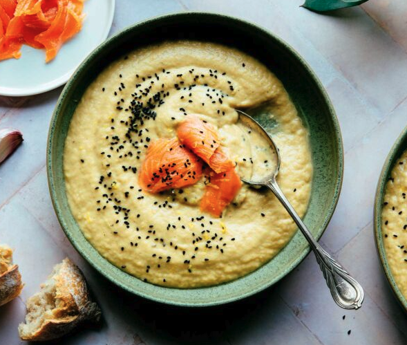 - Σερβίρουμε τη σούπα σε μπολ, μοιράζουμε στο καθένα από λίγη πέστροφα, σκορπίζουμε το ξύσμα και το μαυροκούκι και σερβίρουμε την κρεμώδης σούπα με μαραθόριζα και καπνιστό ψάρι.