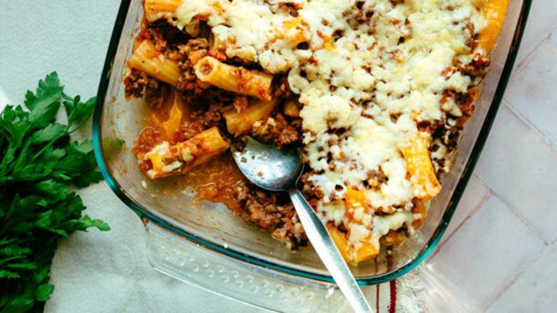 - Ρίχνουμε τα ριγκατόνι και τον μαϊντανό, ανακατεύουμε καλά και αδειάζουμε το όλον σε μέτριο ταψί.