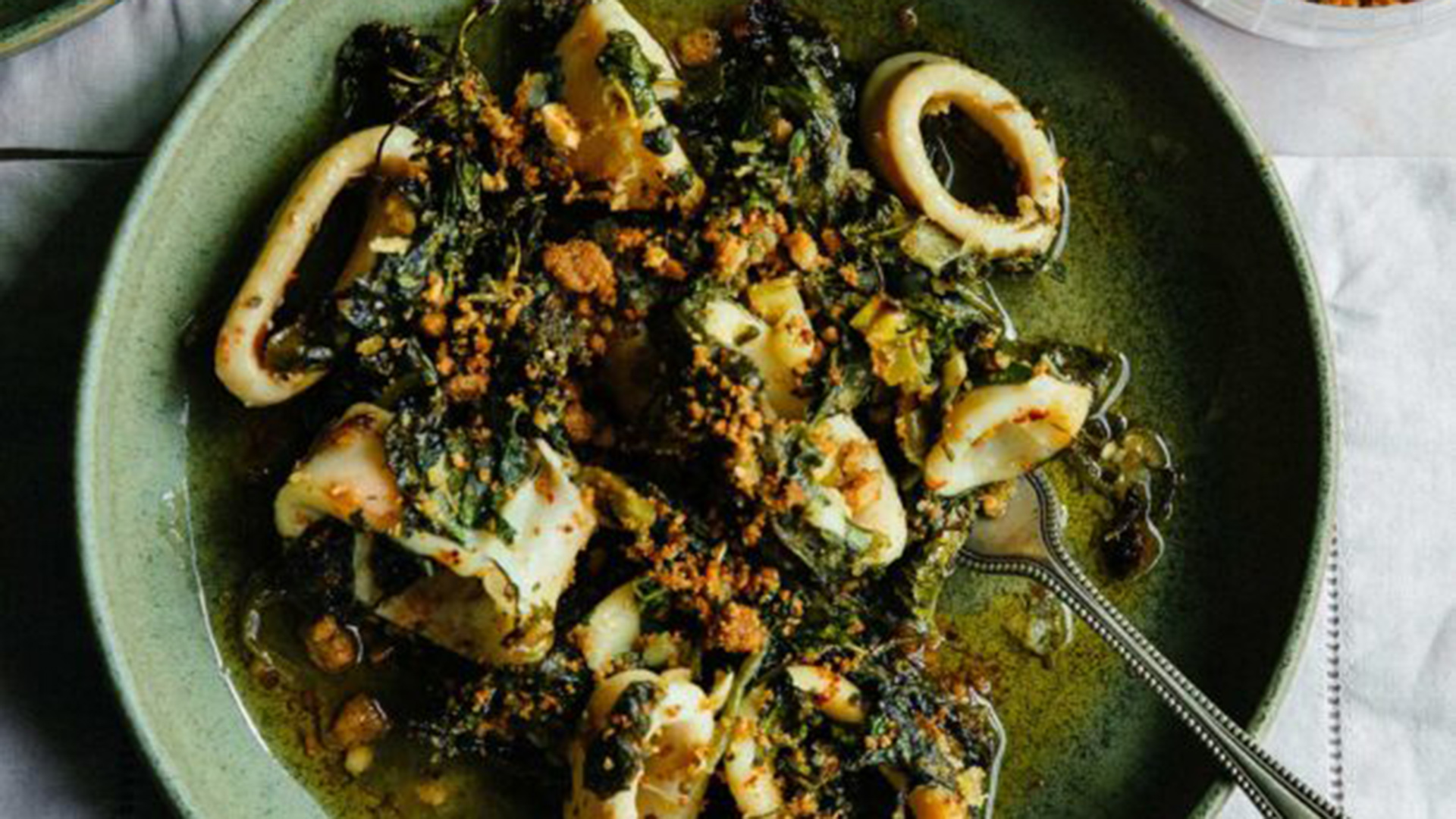 - Σε ένα μέτριο ταψί βάζουμε τα καλαμάρια και το σπανάκι.